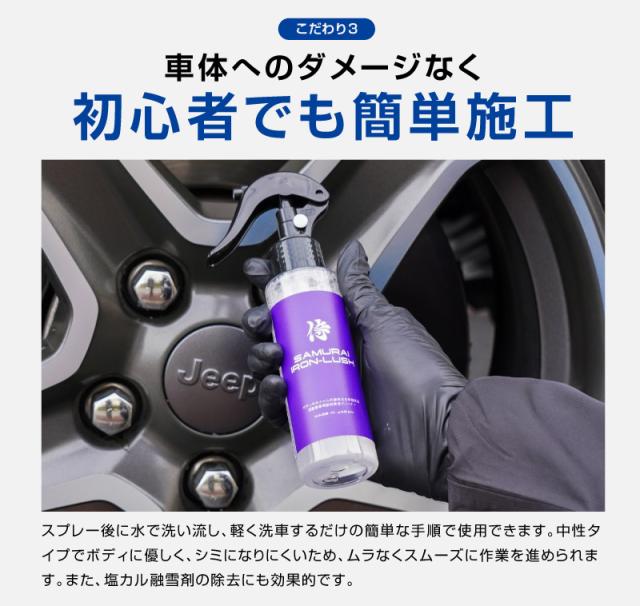 サムライアイアンラッシュは、初心者でも扱いやすい自動車専用の鉄粉除去クリーナーです。