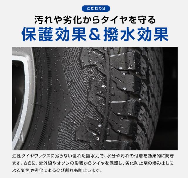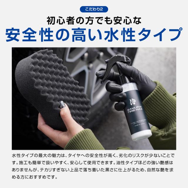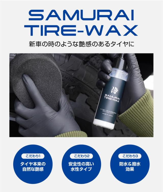 サムライタイヤワックスは、水性でタイヤに優しく自然な艶を長持ちさせます。高級シリコーン配合で紫外線や汚れから守りひび割れや色褪せのリスクを軽減できます。