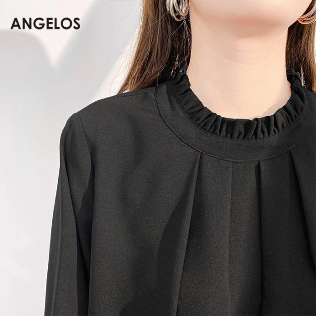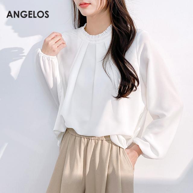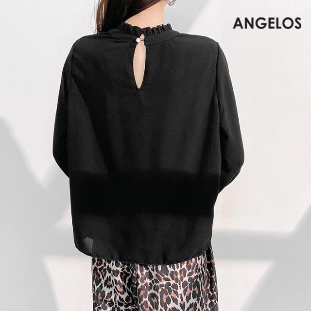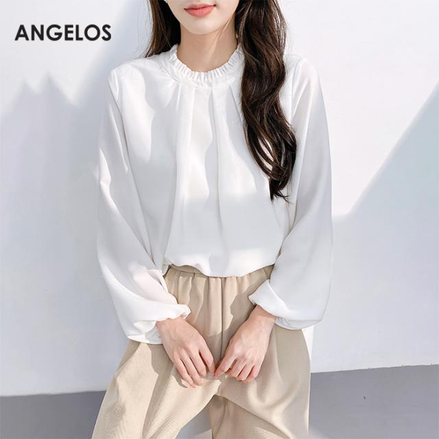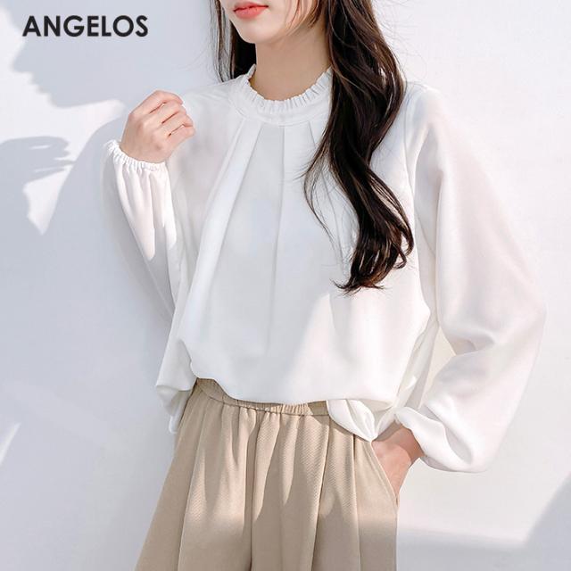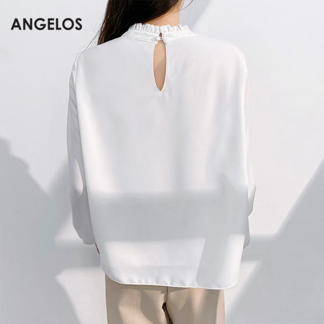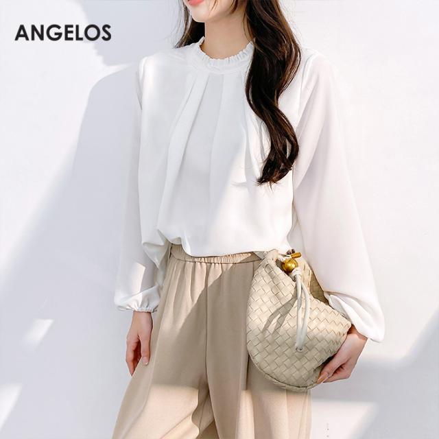 〈6,300円〜!クーポンで〉トップス レディース フリル タック入り シアーブラウス 裏地付き 透け感 上品 ブラウス ホワイト 大きいサイズ S M L LL XL ANGELOS 【フリル襟前身頃タック入りブラウス】ダークエンジェル 春新作 ●即納●