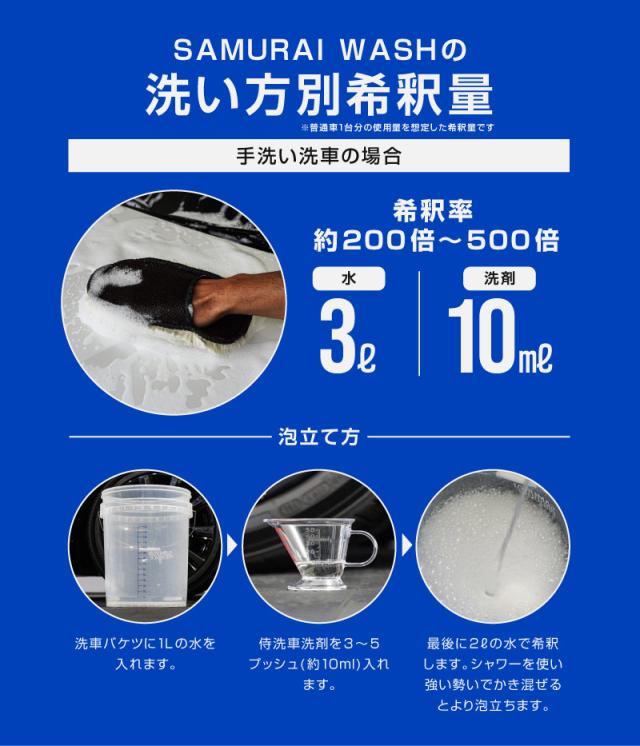 サムライウォッシュは、ノーコンパウンドで全塗装色・コーティング施工車対応の中性洗車洗剤です。キメ細かい濃密な泡立ちで汚れを包み込むことで、買ったばかりの新車を傷つけることなく洗車をサポートします。