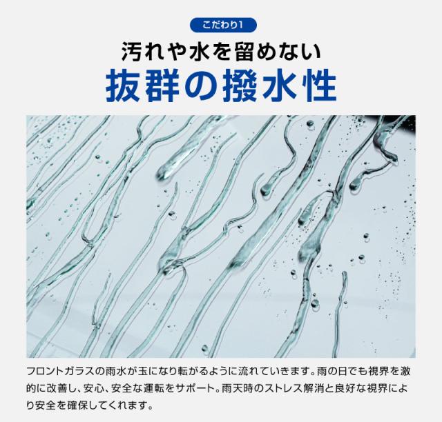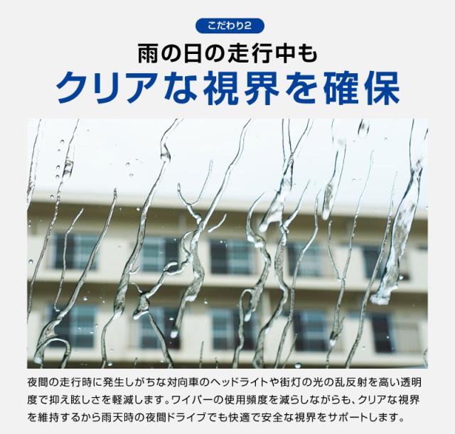 雨水を玉のように弾いて視界をクリアに保ち、夜間の対向車のライトの乱反射を抑えます。