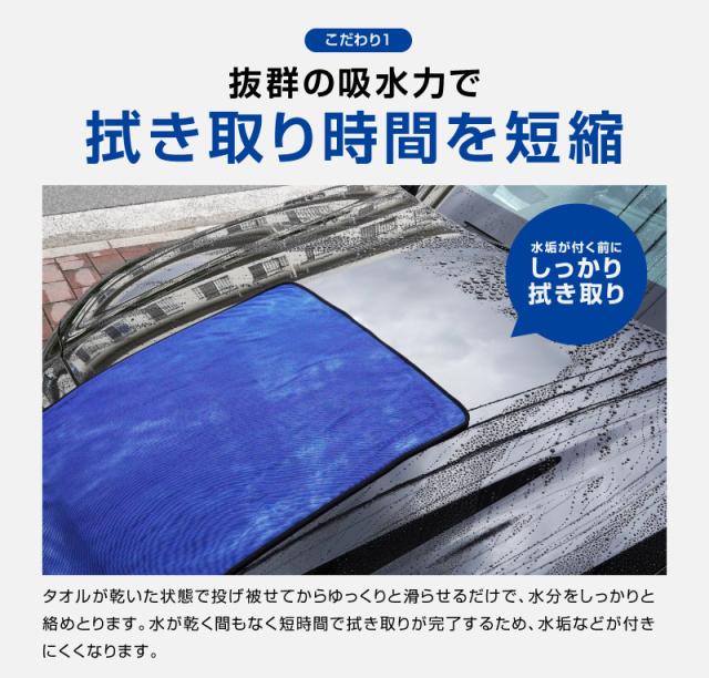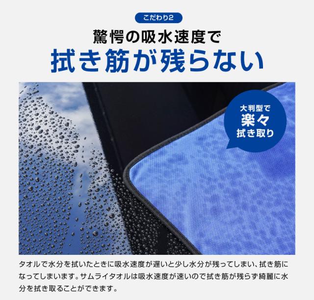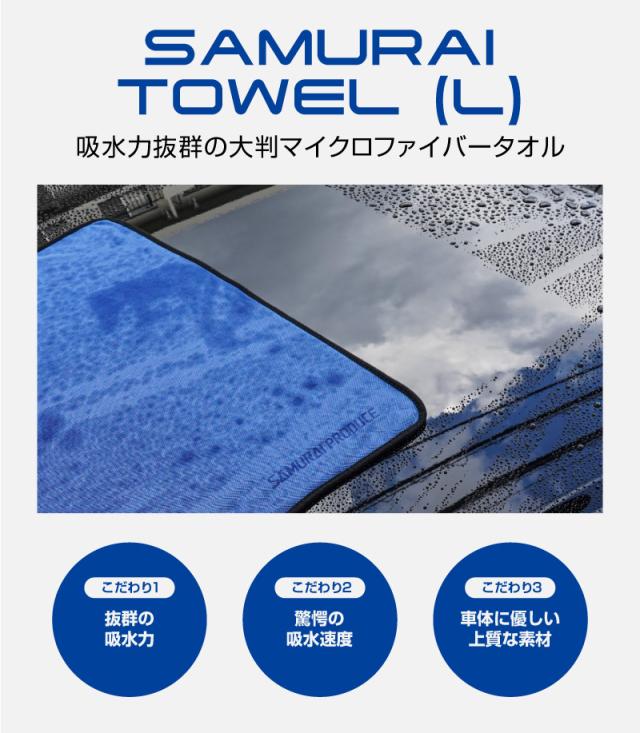 サムライタオルは、サムライプロデュースとコーティング職人が共同で研究して作り上げた最上級品質のタオルで、吸水性・速乾性に優れているマイクロファイバーを使用しています。70cm×90cmの大きなサイズなので、これ1枚で車体全体のほとんどの水分を拭き上げる事ができます。