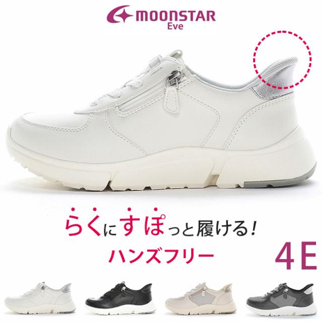 ムーンスター イブ スニーカー コンフォートシューズ レディース ハンズフリー 4E 幅広 滑りにくい 歩きやすい 疲れにくい つまづきにくい 軽い やわらかい 痛くない 履きやすい サイドジップ ファスナー 外反母趾 EVE 334 黒 スニーカー シューズ 靴