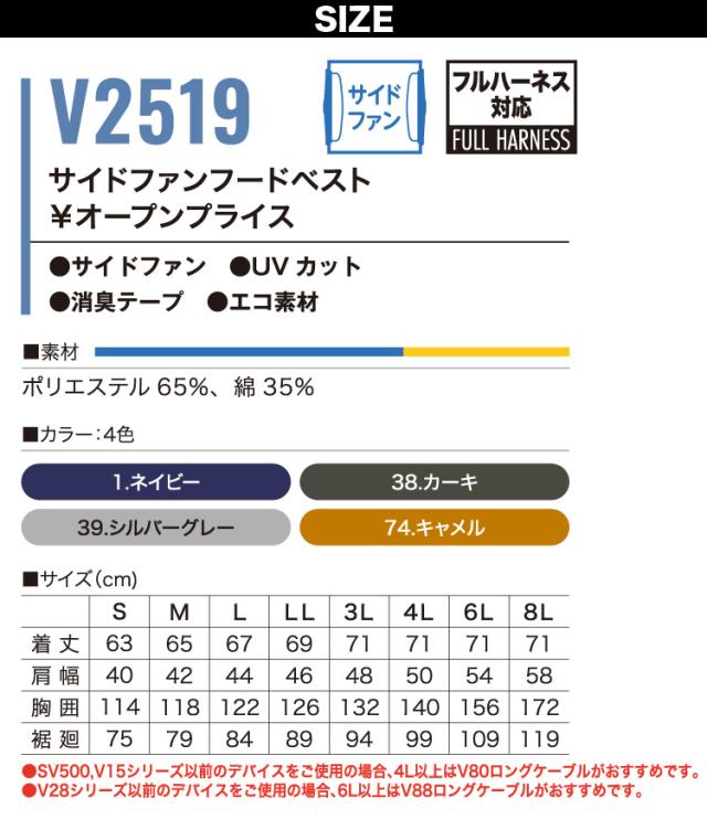 快適ウェア 空調作業服 サイドファンベストジャケット/15VファンバッテリーフルセットV2519/SV500 M〜6L8L フルハーネス対応 UVカット 電動ファン用ウェア