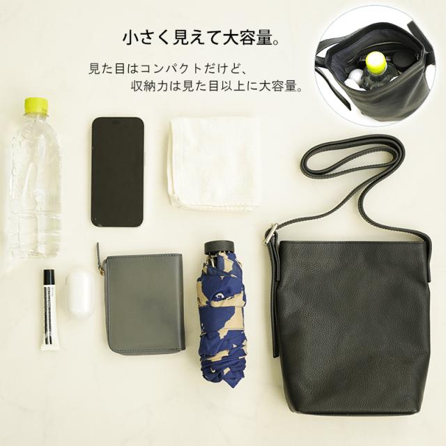 ・スマートな見た目ながら、500mlペットボトルや折り畳み傘、財布も楽々入れられます。