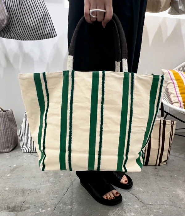 薄手のキャンバスに立体感のあるループ刺繍と同色のフロッキープリントが施されたストライプbag