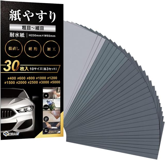 - バイクのヘッドライトが経年劣化により黄ばみや小傷が目立つ様になった為、研磨してウレタンクリアー塗装をする為に購入。 粗目の400番から5000番までの耐水ペーパーが、10サイズ各3枚づつ入っているので...
