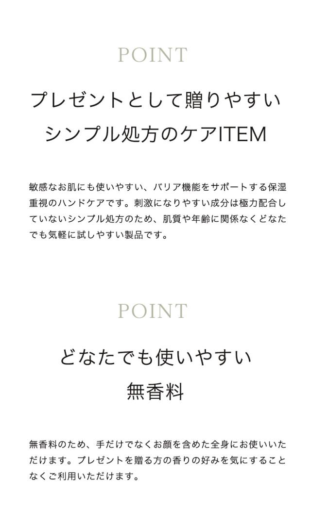 ハンドクリーム、ボディークリームとしてはもちろん、シンプル処方&無香料でお顔の保湿クリームとしてもお使いいただけます。