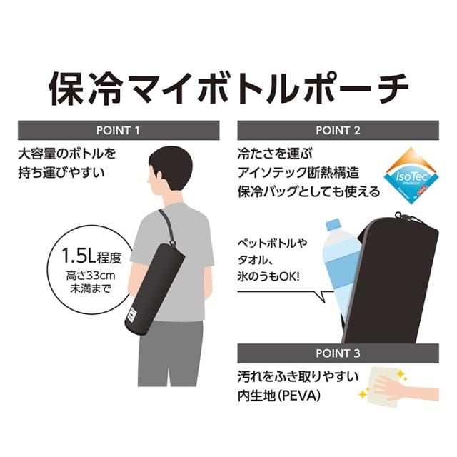 ●1L〜1.5Lの保冷&保温ボトルを持ち運べる ●「アイソテック」断熱構造。保冷バッグとしても使える ●汚れをふき取りやすい内生地(PEVA) ●手洗い可