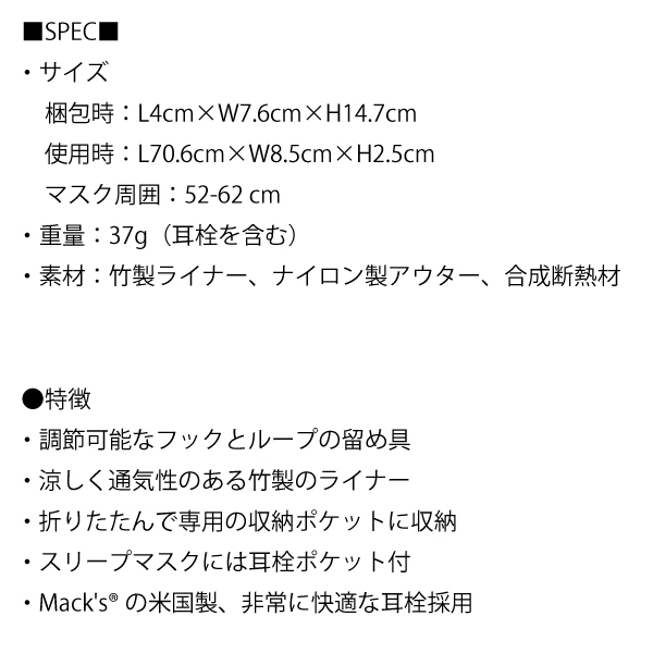 ・サイズ 梱包時:L4cm×W7.6cm×H14.7cm 使用時:L70.6cm×W8.5cm×H2.5cm マスク周囲:52-62 cm ・重量:37g(耳栓を含む) ・素材:竹製ライナー、ナイロン製アウター、合成断熱材 |