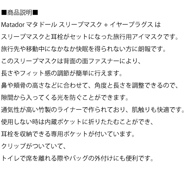 マタドール Matador / スリープマスク + イヤープラグス / 20370069 / 耳栓 旅行用アイマスク / 通勤 通学 バス 電車 旅行 飛行機 キャンプ