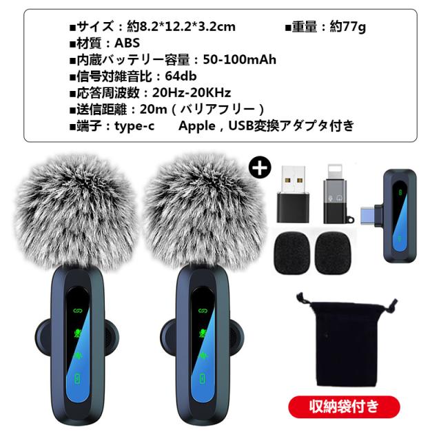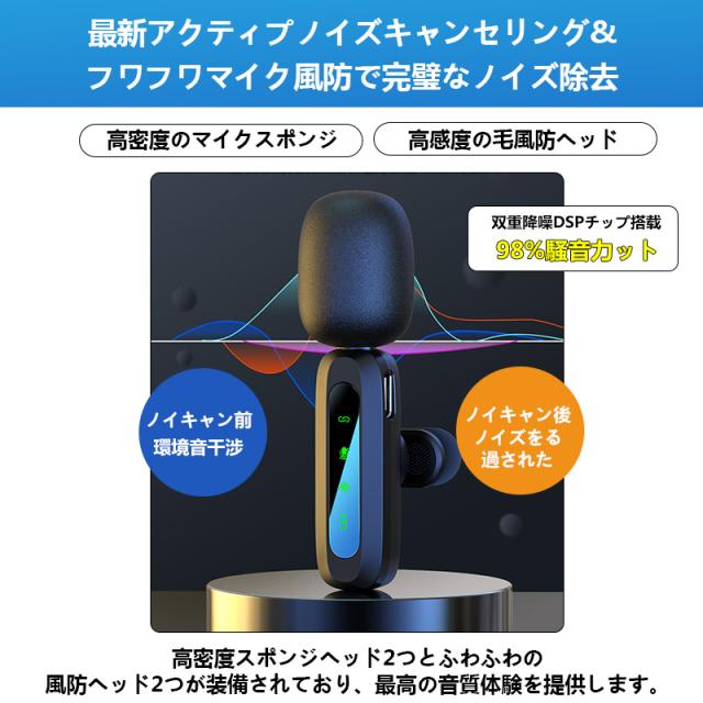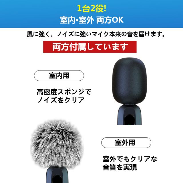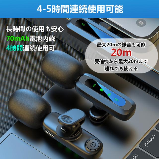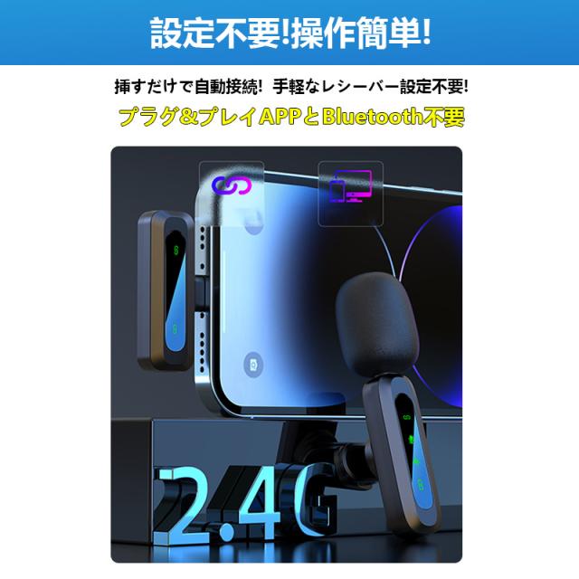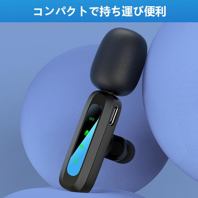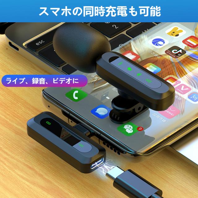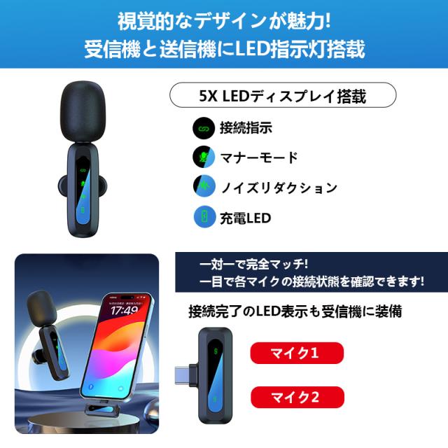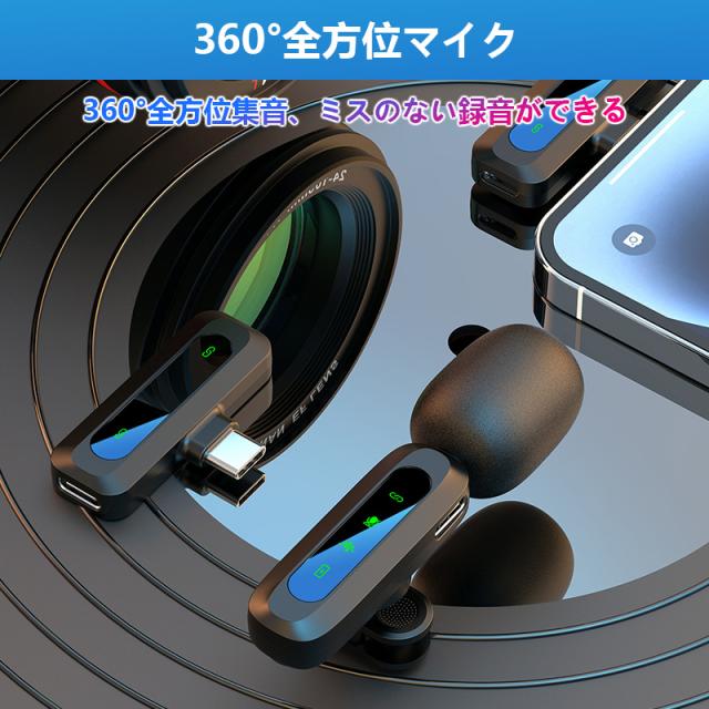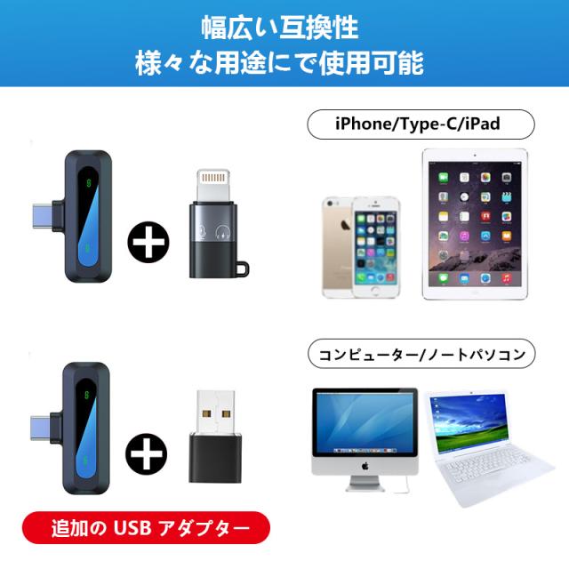 ピンマイク ピンマイク ワイヤレス iPhone/iPad/PC対応 1to2 瞬時接続 LED指示灯搭載 ノイズ軽減 音画同期 360°集音