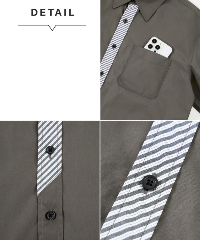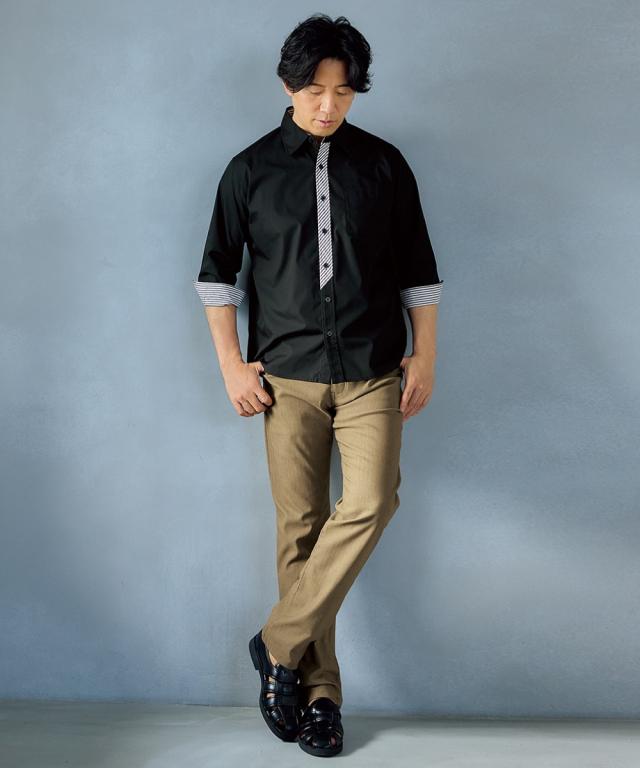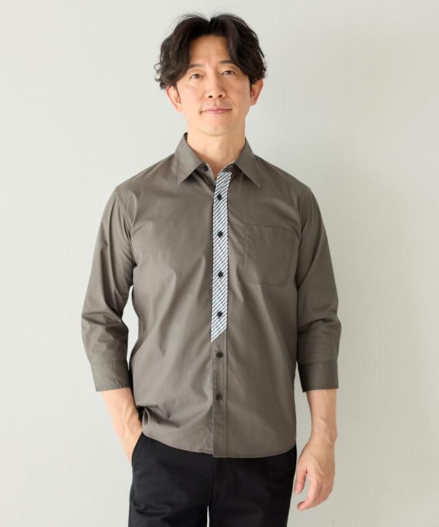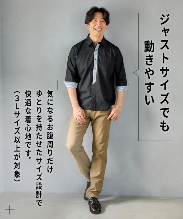 前立て・衿裏・袖裏の配色使いデザインがさりげないポイントとなる7分袖シャツ。さらりとした肌ざわりで着心地のよい綿混素材です。3L以上は、お腹まわりや肩まわりにゆとりをもたせた独自設計です。大きいサイズも展開しております。(M/L/LL/3L/4L/5L/6L/8L/10Lサイズ)■デザイン前立て部分にチェックをあしらったデザインがこなれた印象。3L以上のサイズにはお腹まわりにゆとりを持たせたこだわりの設計で、『肩幅・着丈・袖丈はジャストサイズなのにお腹まわりが少し窮屈・・』と言うお悩みにも解決!1サイズ上げる事なくスッキリ着こなせます。ボトムを選ばない合わせやすいカラー展開■素材綿混素材でお手入れもしやすく、着心地も ■おすすめのおしゃれスタイリングシックなカラーのパンツと合わせると上品さが生まれます。細身のパンツとあわせてクールな印象にも。