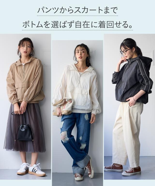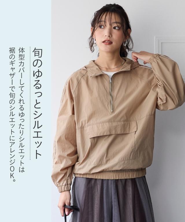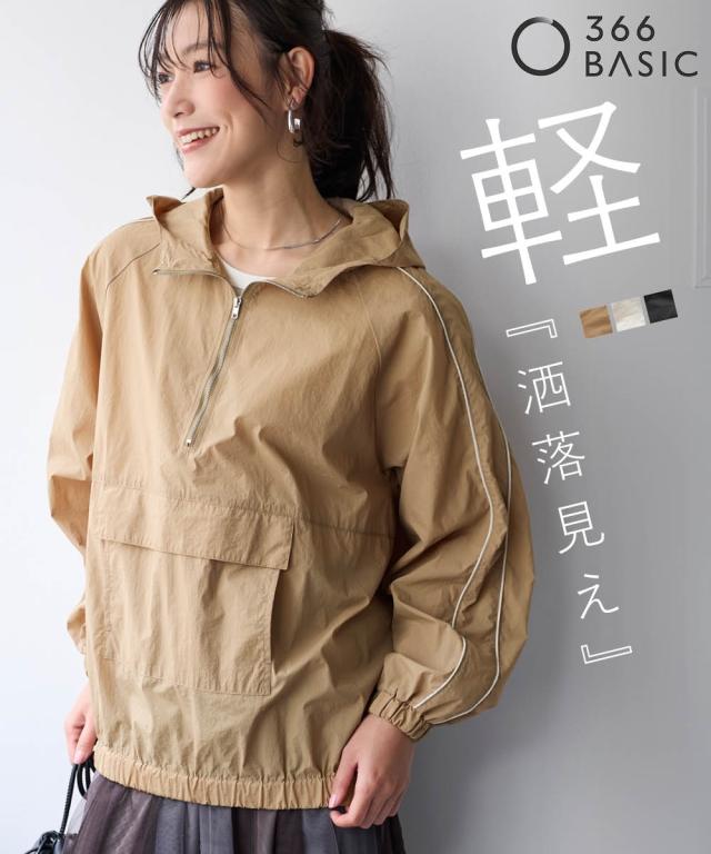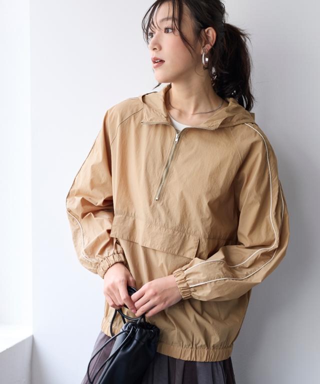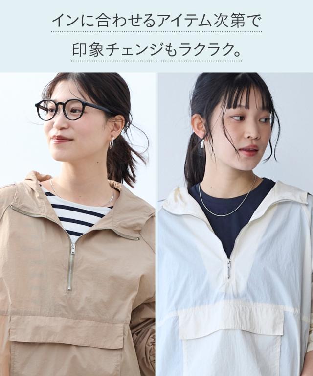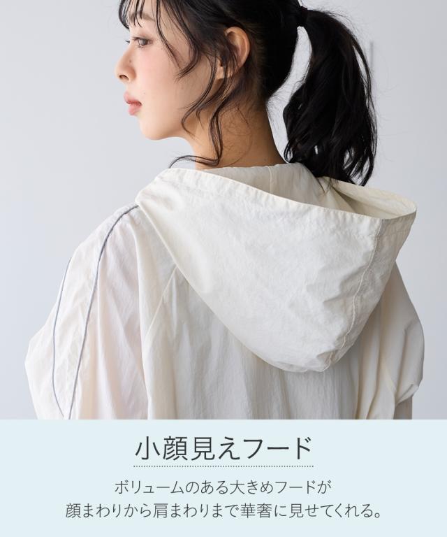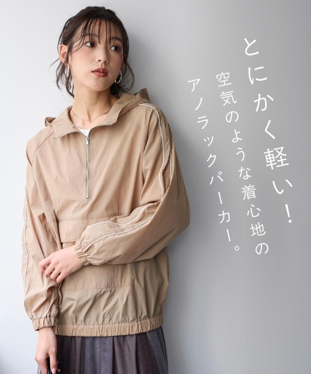 空気のような着心地。初夏の万能羽織、アノラックパーカー登場■デザイン配色パイピングがポイントのアノラックパーカー。裾にはギャザーゴム入りで旬のシルエットに。ブラウジングもできるし、隙間ができないから裾から風が入り込まない防風対策にも。襟元ジップの開閉でレイヤードに抜け感を。大き目フードで小顔効果も ■素材軽やかなエアーナイロンを採用。空気をまとっているような軽さが特徴で、洗いっぱなしのような生地本来の表面感(ワッシャー)が、シワを目立ちにくくさせるため、持ち運びにも最適です。ナイロン素材なのでアウトドアにも最適。■おすすめのスタイリングアウターとしてもトップスとしても着用可能。幅広い着回しが可能なので季節の変わり目にライトアウターとしても重宝します。