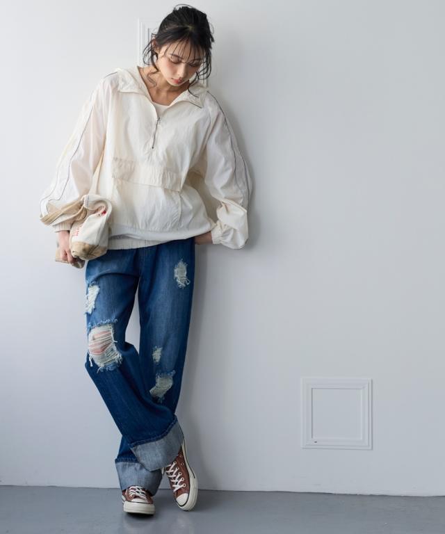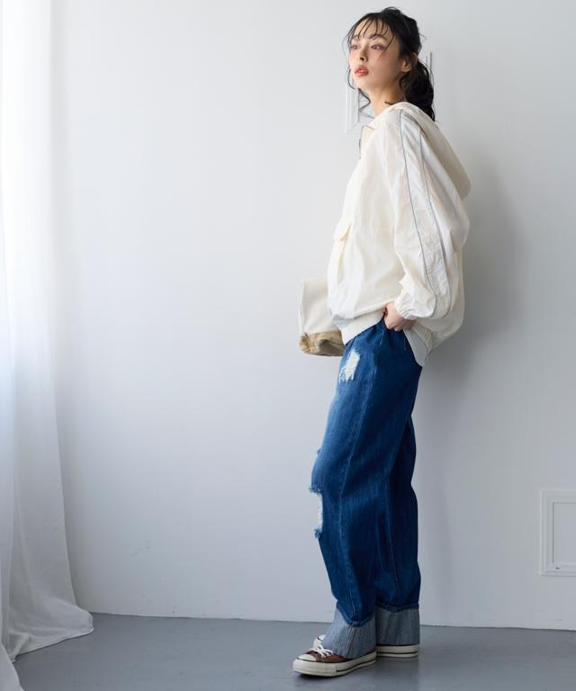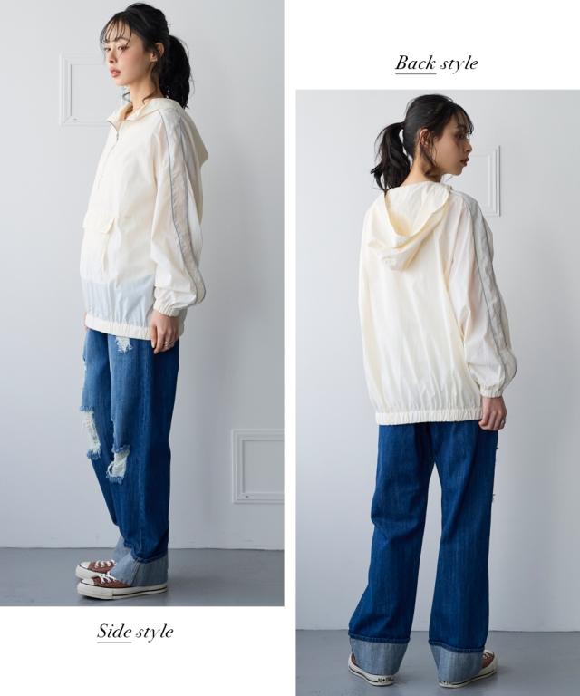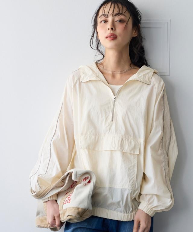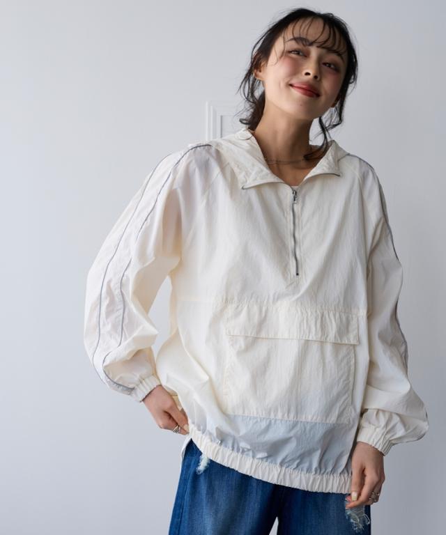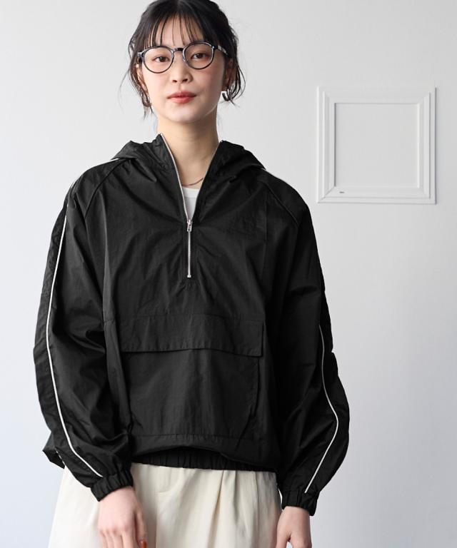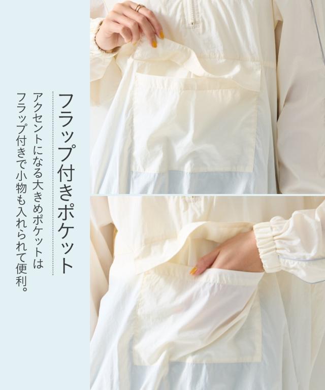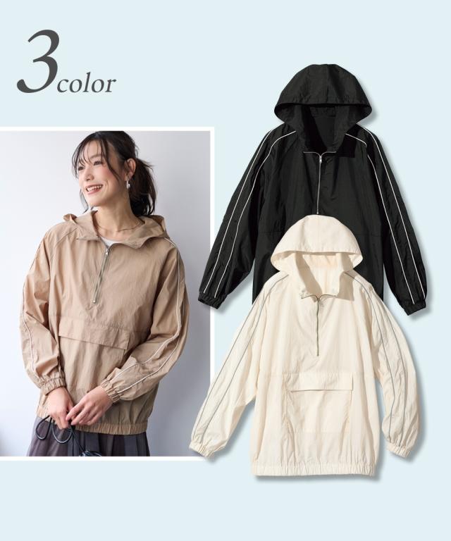 空気のような着心地。初夏の万能羽織、アノラックパーカー登場■デザイン配色パイピングがポイントのアノラックパーカー。裾にはギャザーゴム入りで旬のシルエットに。ブラウジングもできるし、隙間ができないから裾から風が入り込まない防風対策にも。襟元ジップの開閉でレイヤードに抜け感を。大き目フードで小顔効果も ■素材軽やかなエアーナイロンを採用。空気をまとっているような軽さが特徴で、洗いっぱなしのような生地本来の表面感(ワッシャー)が、シワを目立ちにくくさせるため、持ち運びにも最適です。ナイロン素材なのでアウトドアにも最適。■おすすめのスタイリングアウターとしてもトップスとしても着用可能。幅広い着回しが可能なので季節の変わり目にライトアウターとしても重宝します。