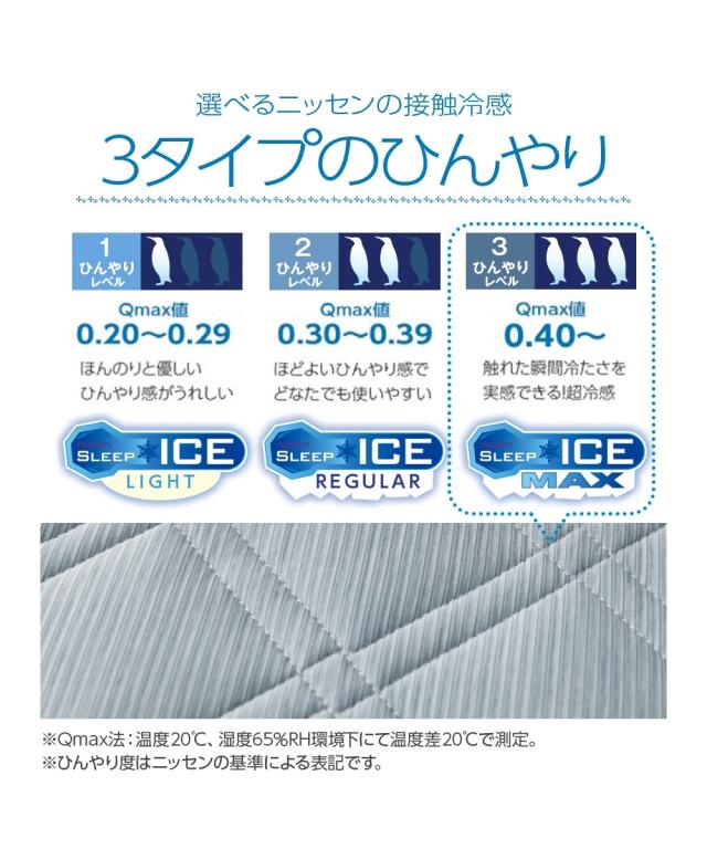簡単装着!置くだけ簡単敷パッドが超冷感シリーズから新登場!触れた瞬間ひんやり!熱を素早く吸収・放出し、快適な睡眠をサポートします。ベッドや布団に置くだけでOK!ゴムバンド付きでずれにくいので、寝返りをしても安心です。汗をかきやすい夏でも、洗濯機で丸洗いできるのでいつでも清潔に使えます。●種類【敷きパッドの魅力】マットレス・敷布団の上やボックスシーツ・敷きカバーなど、その上に敷いてお使いいただけます。肌に直接触れるので、肌触りや保温性などを敷きパッド1枚で調整することが可能です。また、シーツの上に重ねることで、気軽に取りはずしてこまめに洗濯できるのも大きな魅力です。●タイプ【敷きパッド・ベッドパドとは】マットレスや敷布団などに簡単に設置できる一般的な敷きパッド、ベッドパッドです。●ブランド・シリーズ【nissen SLEEP ICE】スリープアイスって触れた瞬間にひんやりとした心地よさを感じる接触冷感素材を使用したニッセンオリジナル商品です。ひんやりのレベルを3段階(LIGHT・REGULAR・MAX)で表示しています。 あなたに最適のお好みのひんやり感が選べます。