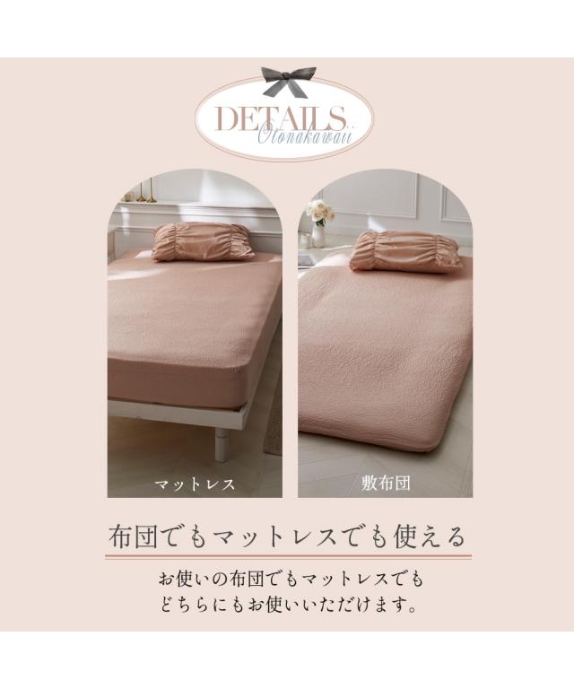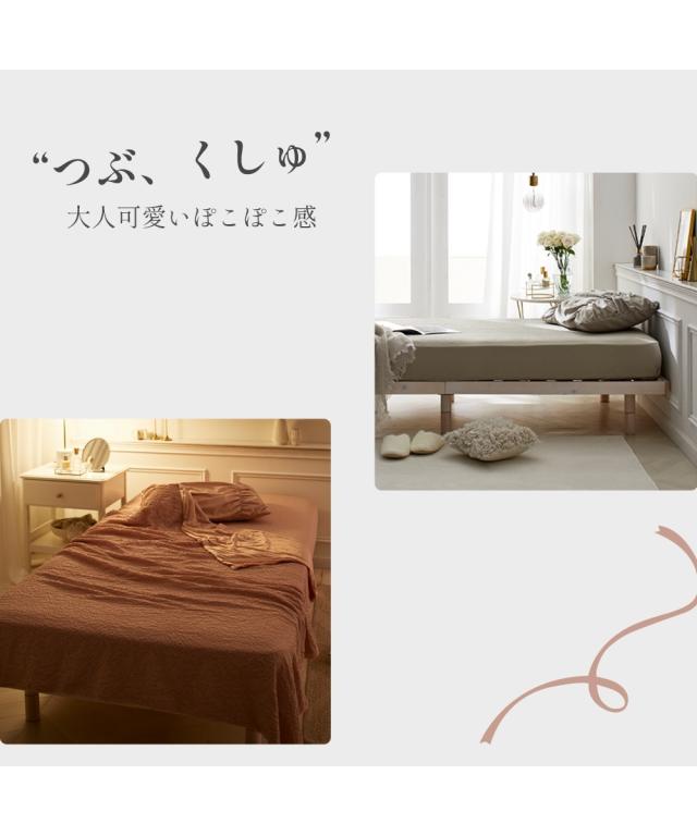つぶ、くしゅ。大人可愛いぽこぽこ感fleu;eから大人可愛いボックスシーツが登場。ぽこぽこしたつぶくしゅ生地で、表面の凹凸がお部屋に優しいニュアンスをプラス。シンプルながらも、おしゃれな雰囲気を演出します。オールシーズン快適にお使いいただけます。【NEW BRAND DEBUT】この度、新しいブランドが誕生しました。fleu;e(フルーエ)[BRAND CONCEPT]毎日を可愛く、毎日を自分らしく。あなたはどんな時間が好きですか友人や家族と団らんするときカフェでお気に入りのドリンクを飲むとき花を愛でるときその一瞬一瞬を過ごす時間によって居心地を感じ、嗜好に変化します。私たちは好みや個性を尊重し、心ときめくデザインや夢中になるラインナップを通して、お客様の「好き」を形にして、あなたがあなたらしく暮らせる時間を提供します。完璧でなくても大丈夫。 凛とした花のように、ありのままの自分に自信を持ち、胸を張って、毎日が自分らしく輝けるように私たちは寄り添います。<おすすめ>point1 ぽこぽこしたつぶくしゅ生地つぶ感のあるリップル生地を採用。さりげないくしゅっと感で、甘すぎず大人可愛い印象に。point2 ニュアンスカラースモーキーなくすみカラーでお部屋に馴染みやすくな