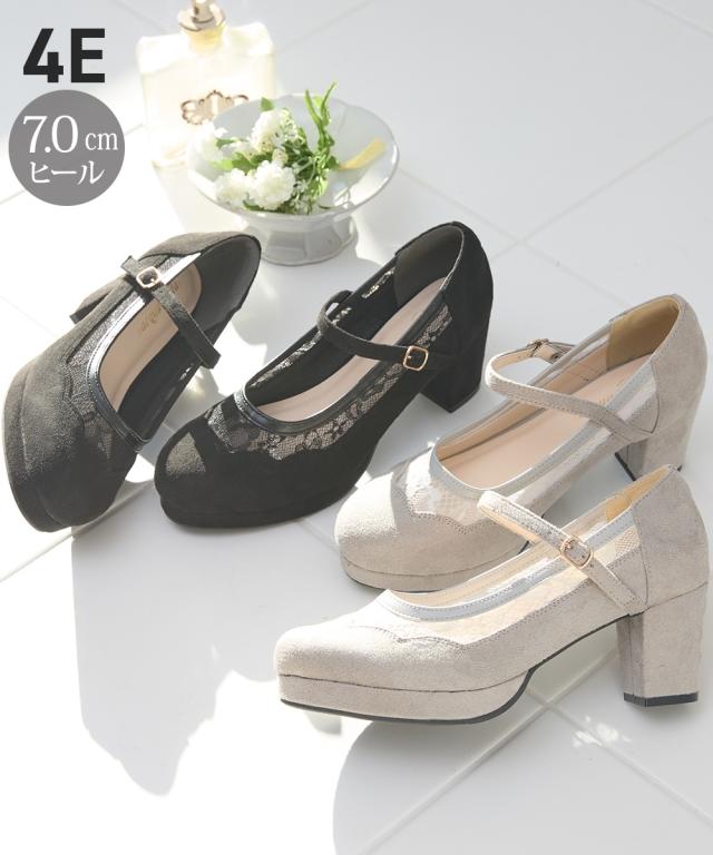 つま先、ヒール、アッパーデザインが上品さとフェミニンさを演出してくれるレースチュールパンプス。さりげないレースチュールのデザインが足元に上品さとオシャレ感をプラス。ホック式のストラップで、脱ぎ履ぎ楽チンです ■ポイント・約7cmのヒール高が、前ストームが約1.5cmあるので足の傾斜が減り、チャンキーヒールで歩きやすい・ストラップ付でホールド感&安定感アップ!・低反発中敷入りで疲れにくく歩きやすいのもうれしいポイント・パーティ、セレモニーなどのフォーマルシーンまで幅広く活躍・アッパーのカッティングと透け感のあるチュールの組み合わせが可愛らしさもプラス【ニッセンオリジナルの大きいサイズ規格】本当に合う靴に出会った事はありますかニッセンの4Eは、靴底の幅を広げ、甲や足首周りもゆったりの独自設計。靴のサイズにお悩みのお客様へ向けて、サイズが大きくてもバランス良くきれいに見えるよう企画したオリジナルシューズです。