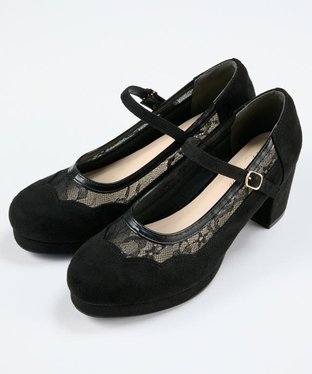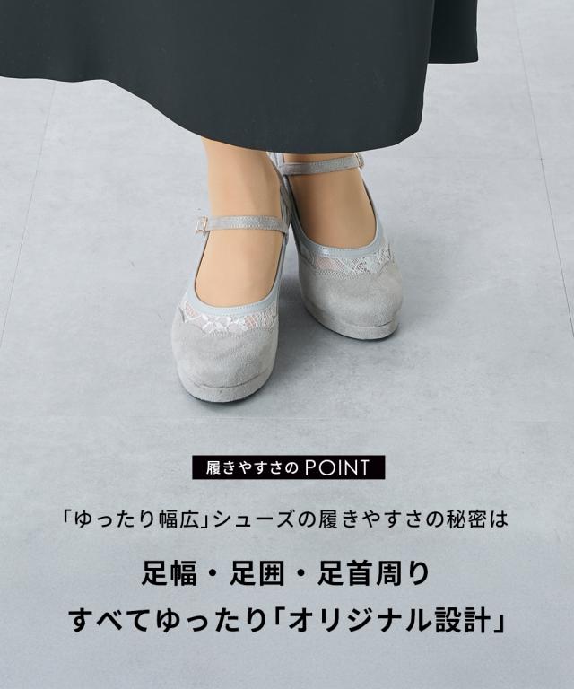 大きいサイズ レディース ゆったり幅広 ストーム付チュール ストラップ パンプス 低反発中敷 ワイズ4E 靴 シューズ 25/25.5cm ニッセン nissen