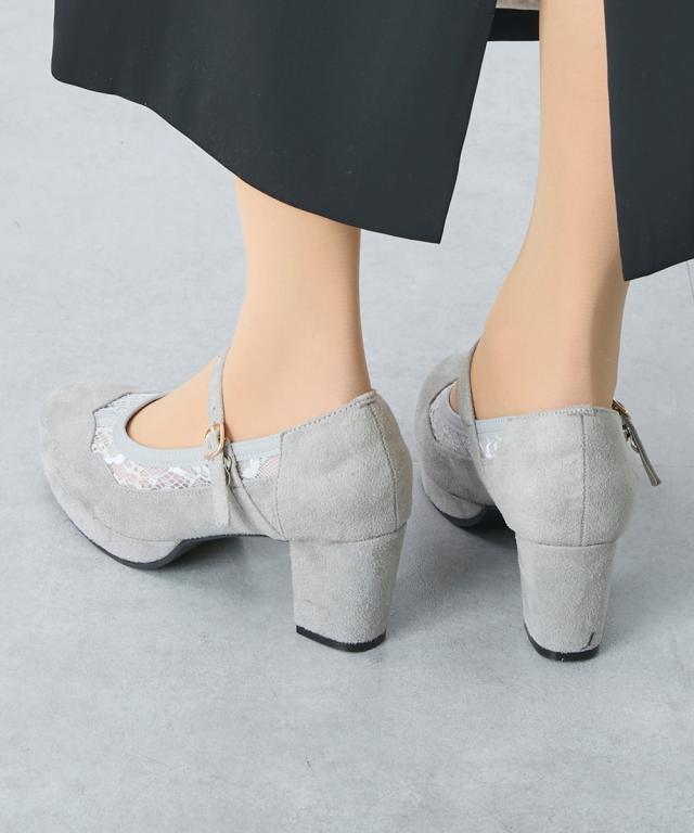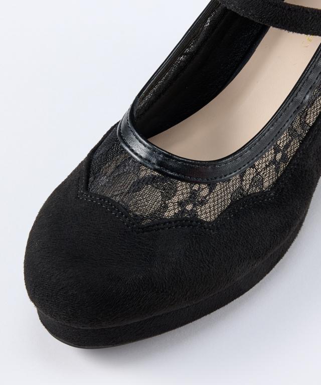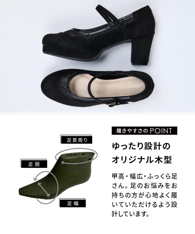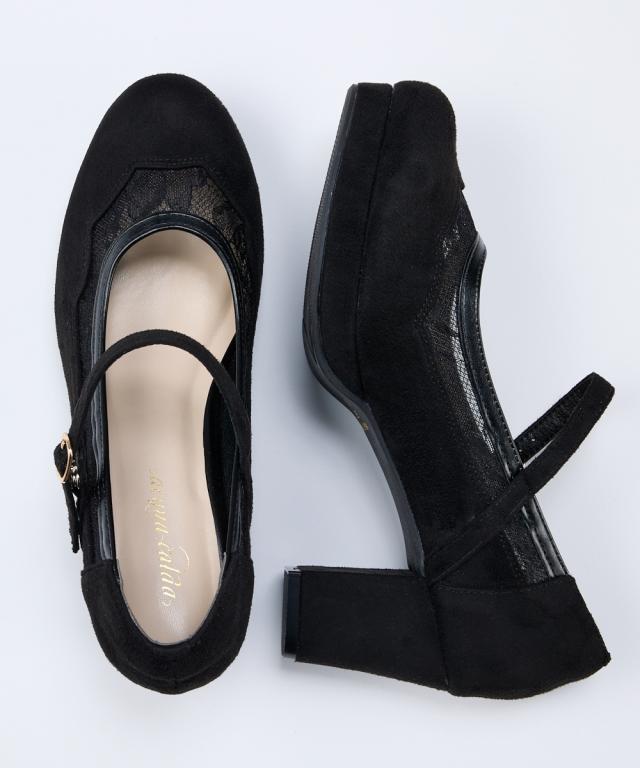 【ゆったり幅広】ストーム付チュールストラップパンプス(低反発中敷)(ワイズ4E)