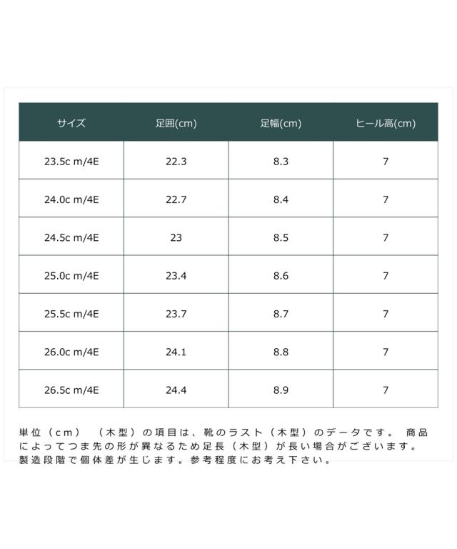 材質=合成皮革(スエード調)・合成繊維 底材=合成底 底の厚さ(前)=約1.5cm ヒール=約7cm ワイズ=4E 重量=約320g(4E:24.5cm片足) ※生産時期や素材などによって多少個体差があります。 ※柄の出方が多少異なる場合があります。 原産国:中国製 備考:単位(cm) ※(木型)の項目は、靴のラスト(木型)のデータです。 ※商品によってつま先の形が異なるため足長(木型)が長い場合がございます。 ※製造段階で個体差が生じます。参考程度にお考え下さい。