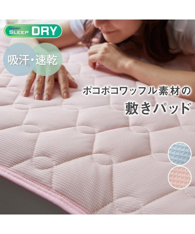 じめじめした日本の夏。寝苦しい夜に、快適な睡眠をお届けする【吸汗速乾ワッフル敷パッド】です。吸汗速乾なので、汗を素早く吸収・発散。サラッとした肌触りで、寝汗をかいてもベタつきにくいです。ワッフル生地の凹凸が、肌との接触面積を減らし、通気性をアップ。熱がこもりにくく、涼しく快適。\ MD voice /非常にお買い得価格ながらも、素材に拘ったワッフル素材の寝具です。是非お手に取っていただけたら嬉しいです!●種類【敷きパッドの魅力】マットレス・敷布団の上やボックスシーツ・敷きカバーなど、その上に敷いてお使いいただけます。肌に直接触れるので、肌触りや保温性などを敷きパッド1枚で調整することが可能です。また、シーツの上に重ねることで、気軽に取りはずしてこまめに洗濯できるのも大きな魅力です。●タイプ【4隅ゴムタイプの敷きパッド・ベッドパッドとは】4隅にゴムが付いており、マットレスや敷布団などに簡単に固定できる一般的な敷きパッド、ベッドパッドです。●色展開2色展開!ピンク・ブルーの2色展開です。優しいお色味で寝室を明るくコーディネートしてくれる2色でおとどけいたします。●サイズ展開シングル・ダブルサイズでのご用意になります。●お手入れ