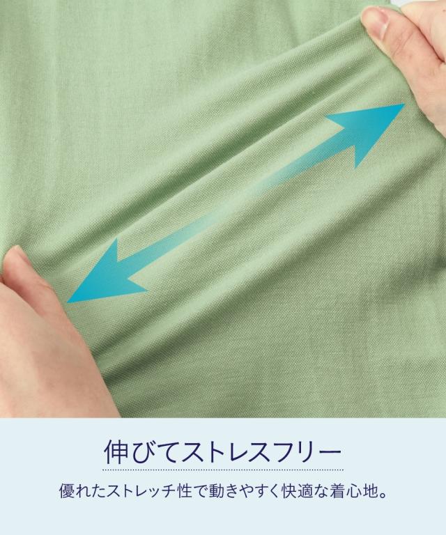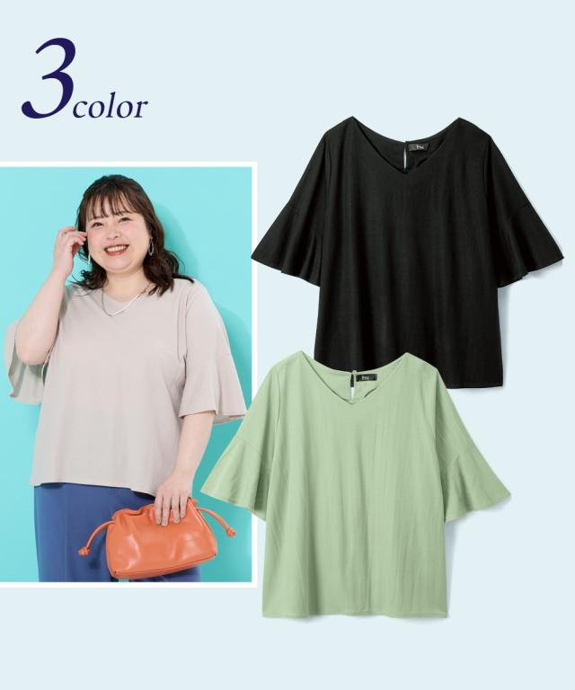 こんなカットソーが欲しかった!!伸縮性があって楽なのに綺麗見え!新感覚ひんやりカットソーシリーズがさらに夏を快適にすごせるようにバージョンアップして新登場!■デザインVネックが顔周りスッキリ。フレアシルエットでお腹周りをふんわりカバーしてくれるので安心です。気になる二の腕もオシャレなフレア袖でカバーしてくれます。■素材布はくのようなしっかり感×カットソーのストレッチの良さをいいとこどりした美ラクRU(ハイブリッド)カットソー。着た瞬間ひんやりCOOL TOUCHなのもうれしいこだわり夏素材☆今年はさらに抗菌防臭付き。汗などで気になる臭い対策に UVカットで日差しもシャットアウトしてくれるので真夏のお出かけに便利。■おすすめのスタイリングいつものパンツと合わせるだけでコーディネートがきまる1枚。ロングスカートやワイドパンツとも合わせやすい丈感になっています。シンプルなデザインなので着回しがきいて便利です