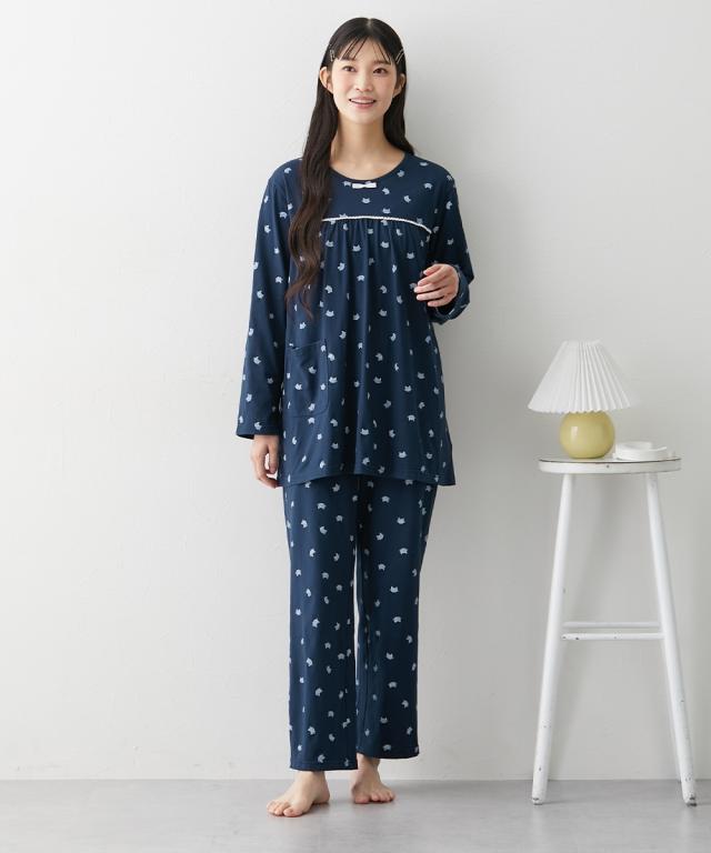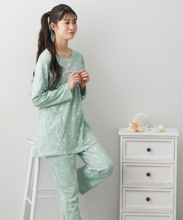 ☆寝る時こそ選びたい、肌にやさしい綿100%パジャマ&ルームウェア☆ 綿100%が気持ちいいパジャマ。薄手の天竺素材でサラッとした肌触りがうれしい。ヨーク切り替えデザインがポイント。ピコレースもアクセントに。長袖なので長く着用いただけます。真夏の冷房対策にも!【おすすめポイント】■綿100%の薄手の天竺素材肌にやさしい天然素材の綿100%。綿は通気性や吸水性に優れており、快適。薄手のTシャツのような天竺はさらっと軽い着心地です。■ヨーク切り替えデザインバスト部分で切り替えのあるデザイン。バスト周りふわっと、ゆったりとした着心地に。ピコレースのアクセントもかわいい。■着丈長めのトップス丈安心感のある長めのトップス着丈。おしりすっぽりで気になる腰回りもカバーしてくれるので体型カバーにも。■薄手の長袖&長ズボンのセット長袖とフルレングスのボトムのセット。薄手なので夏にも着用できます。冷えすぎるのが苦手な方、夏のエアコン対策にもおすすめです。■トップスにポケット付きトップスに小さめポケット付き。ちょっとしたものを入れるのに便利です。■ウエストゴムは取り換え可能ボトムのウエストにゴム取り換え口付き。お好みや必要に応じてゴムの調節や交換