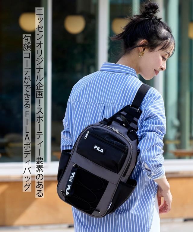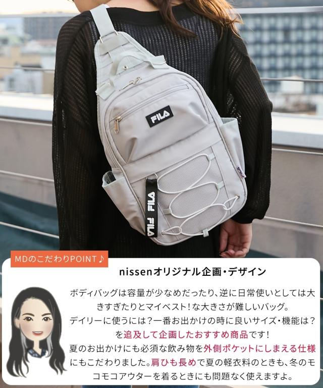 【nissenオリジナル企画・デザイン】毎日使用していただきたいから、ベストなサイズを企画しました。夏のお出かけに必須の飲み物が外側ポケットにしまえる仕様もこだわりです。肩ひも長めで夏の軽衣料のときも、冬のモコモコアウターを着るときにも問題なく使えます。■ポイント・はっ水加工で突然の雨や水濡れも安心・外側両サイドポケットはファスナーで拡張可能・見た目はスッキリ!実は多収納の10ポケット・ショルダーひもの長さは調整でき、取り外しもOK!・FILAのブランドロゴネーム付