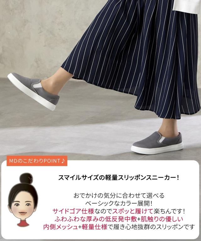 スマイルサイズの軽量スリッポンスニーカー!片足約190g!ベーシックな色展開で気分に合わせておでかけ!サイドゴア仕様なのでスポッと履けてらくちんです! ■ポイント ・片足約190gで軽い履き心地 ・屈曲性のあるソールは歩行時の足裏の動きに馴染み歩きやすい ・履き口両サイドゴムで脱ぎ履きしやすい ・ふわふわクッション入りで優しい履き心地 ・メッシュ素材で通気性アップ ・内側メッシュ素材でサラッと心地良く、快適な履き心地 【ニッセンオリジナルの大きいサイズ規格】 本当に合う靴に出会った事はありますか ニッセンの4Eは、靴底の幅を広げ、甲や足首周りもゆったりの独自設計。 靴のサイズにお悩みのお客様へ向けて、サイズが大きくてもバランス良くきれいに見えるよう企画したオリジナルシューズです。