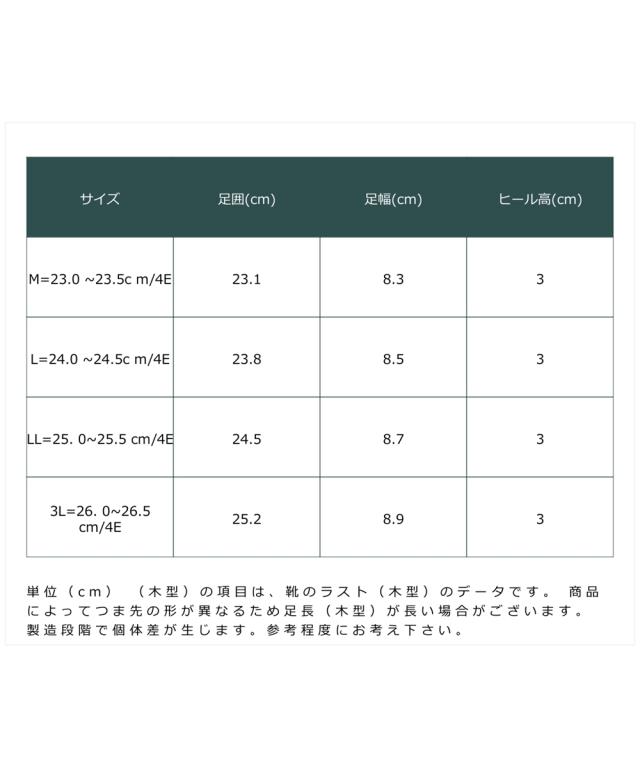材質=合成繊維 底材=合成底 底の厚さ(後ろ)=約3cm ワイズ=4E 重量=約190g(4E:Lサイズ片足) ※生産時期や素材などによって多少個体差があります。 原産国:中国製 備考:単位(cm) ※(木型)の項目は、靴のラスト(木型)のデータです。 ※商品によってつま先の形が異なるため足長(木型)が長い場合がございます。 ※製造段階で個体差が生じます。参考程度にお考え下さい。