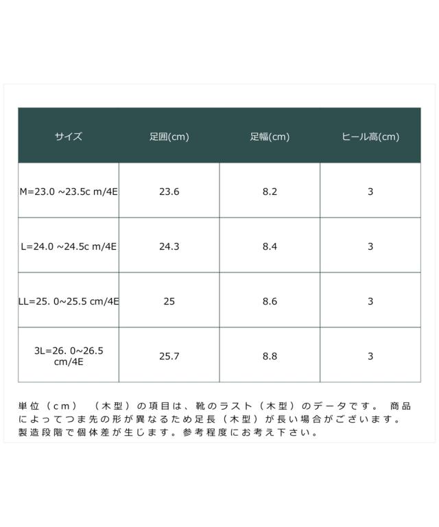 材質=合成繊維 底材=合成底 底の厚さ(後ろ)=約3cm ワイズ=4E 重量=約180g(4E:Lサイズ片足) ※生産時期や素材などによって多少個体差があります。 原産国:中国製 備考:単位(cm) ※(木型)の項目は、靴のラスト(木型)のデータです。 ※商品によってつま先の形が異なるため足長(木型)が長い場合がございます。 ※製造段階で個体差が生じます。参考程度にお考え下さい。