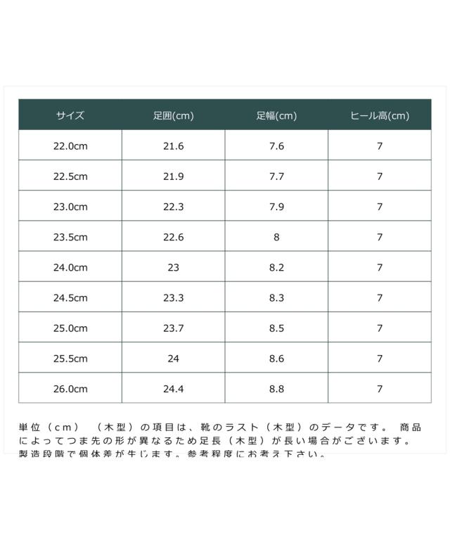 材質=合成皮革 底材=合成底 ヒール=約7cm ワイズ=3E 重量=約240g(3E:24.5cm:片足) ※生産時期や素材などによって多少個体差がございます。 原産国:中国製 備考:単位(cm) ※(木型)の項目は、靴のラスト(木型)のデータです。 ※商品によってつま先の形が異なるため足長(木型)が長い場合がございます。 ※製造段階で個体差が生じます。参考程度にお考え下さい。
