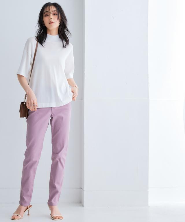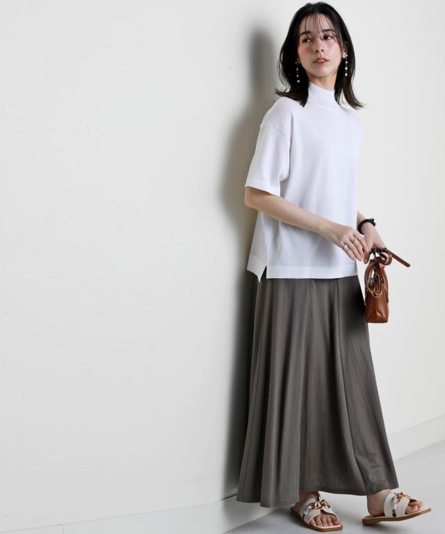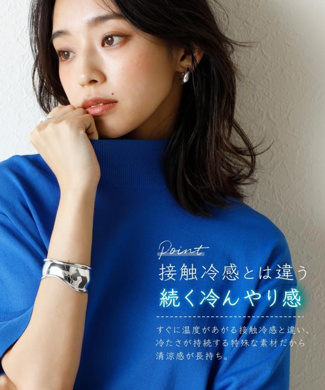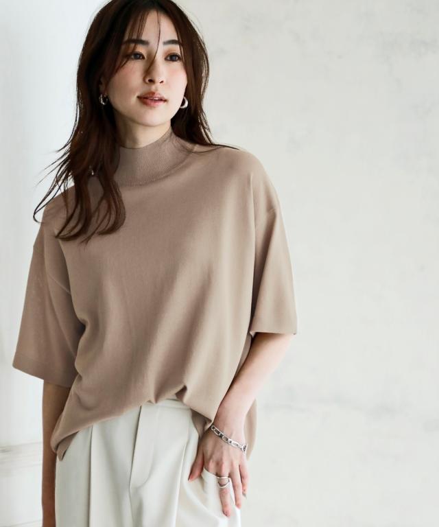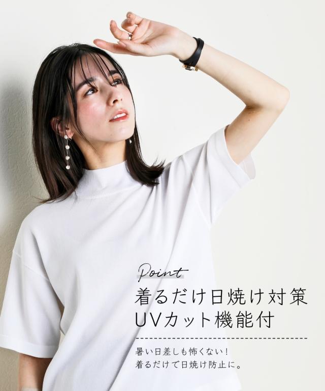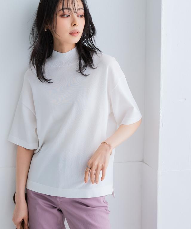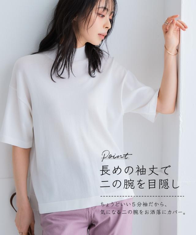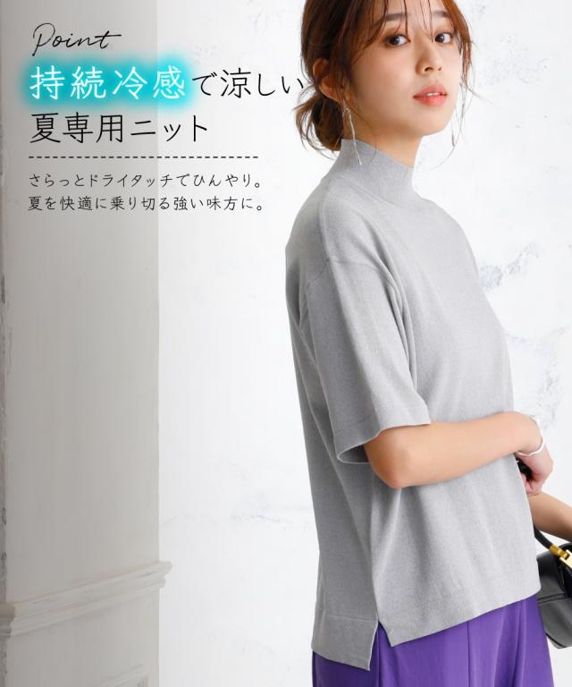 暑い季節に嬉しい!ひんやりが続く「持続冷感」の新素材ニットシリーズです。■デザイン過剰な装飾を省いたクルーネックの5分袖トップスは、どんなスタイルにも合わせやすい万能アイテム。毎日着回したいけどカットソーが苦手・・・そんな方に!デイリー使いできる多機能ニットで上品な着こなしが叶います。シンプルながらも、ネックラインや袖丈、シルエットにこだわり、一枚で着てもサマになるようにデザインしました。ハイネックなので首元の日焼け対策にも ゆとりのある袖巾&長めの5分袖は、気になる二の腕もカバーしつつ涼し気な着こなしに。流行に左右されないベーシックなデザインは、長く愛用できること間違いなしです。■素材さらっとシャリ感のある涼やかな肌触りで快適な着心地。毎日着るものだからこそ、素材の品質と機能性にこだわりました。・ひんやりが続く持続冷感加工・毛玉になりにくく、きれい長持ち・服の温度が上がりにくい遮熱素材・UVカット素材・洗濯機で洗えるのでお手入れもラクラク■おすすめのスタイリングカジュアルなデニムやチノパンはもちろん、きれいめなスカートやワイドパンツとも相性抜群。オフィススタイルには、ジャケットやカーディガンを羽織ってきちんと感
