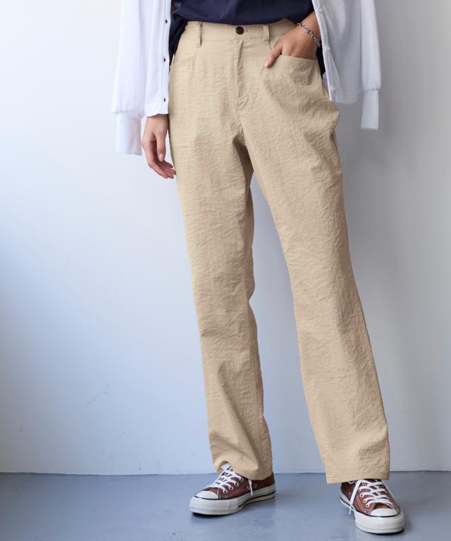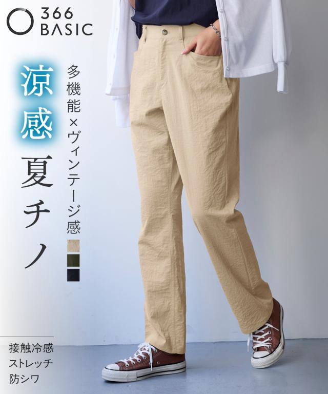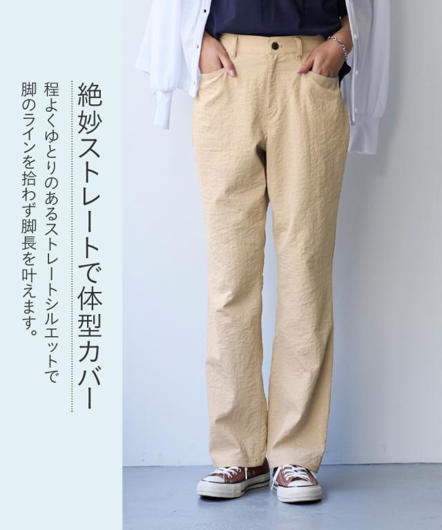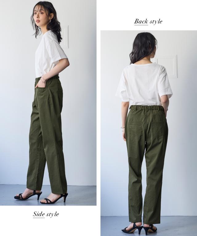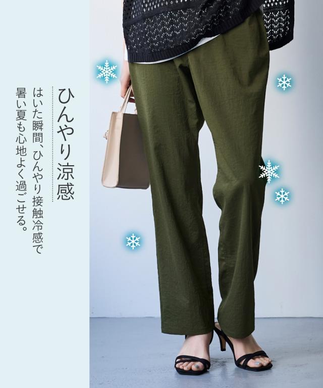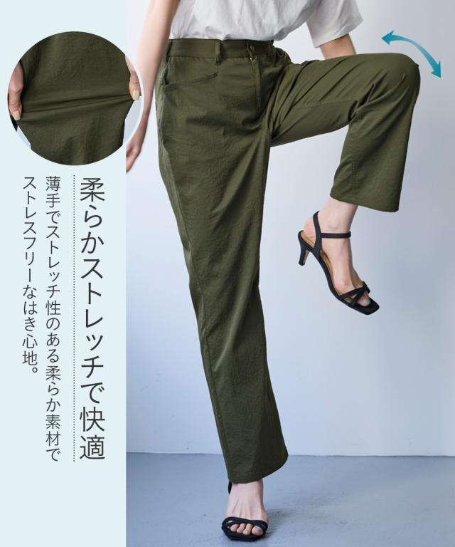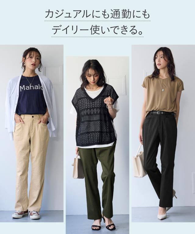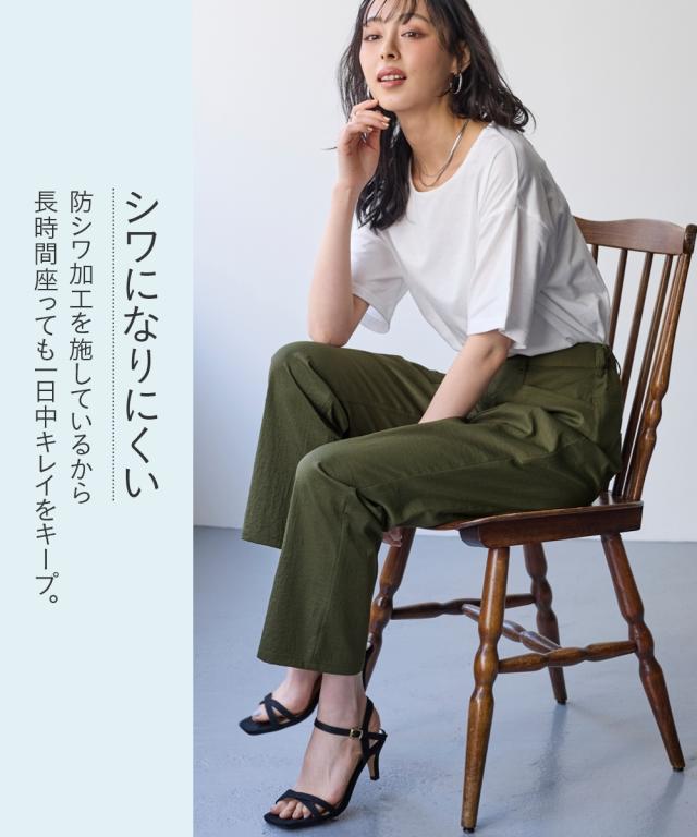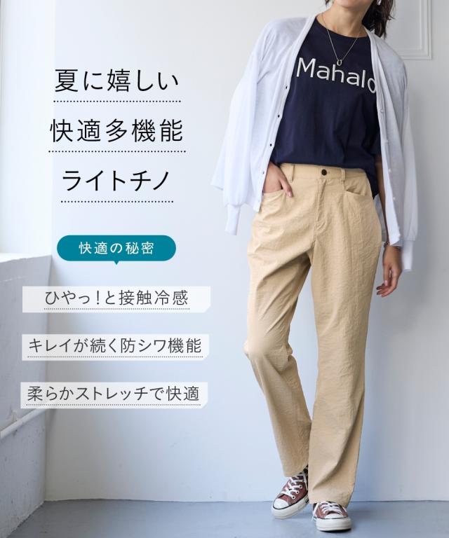 夏の快適ライトチノストレートパンツ。 接触冷感・ストレッチ・シワが付きにくいの多機能素材という優れもの ■デザイン シンプルデザインで、すっきり見えるストレートシルエット。 ウエストは、後ろゴム入りで前はすっきり履きこなしながら、着脱もらくちんなストレスフリーな履き心地。 前後に便利なポケット付き。 ■素材 生地の表面の細かいシボ感と、柔らかな光沢が独特の風合いが上品見えします。 さらりとした肌触りに、接触冷感・ストレッチ性・シワが付きにくいの多機能素材。 お洗濯後のシワも目立ちにくく、履き心地もお手入れも快適な万能素材です。 シワにもなり難く、お手入れも楽なので、旅行時などの長時間着用でも気にせずに過ごせるのも魅力です。 ■おすすめのスタイリング Tシャツ合わせのラフな着こなしのほか、きれいめなブラウスやシャツと合わせた大人のカジュアルなコーディネートを楽しめます。