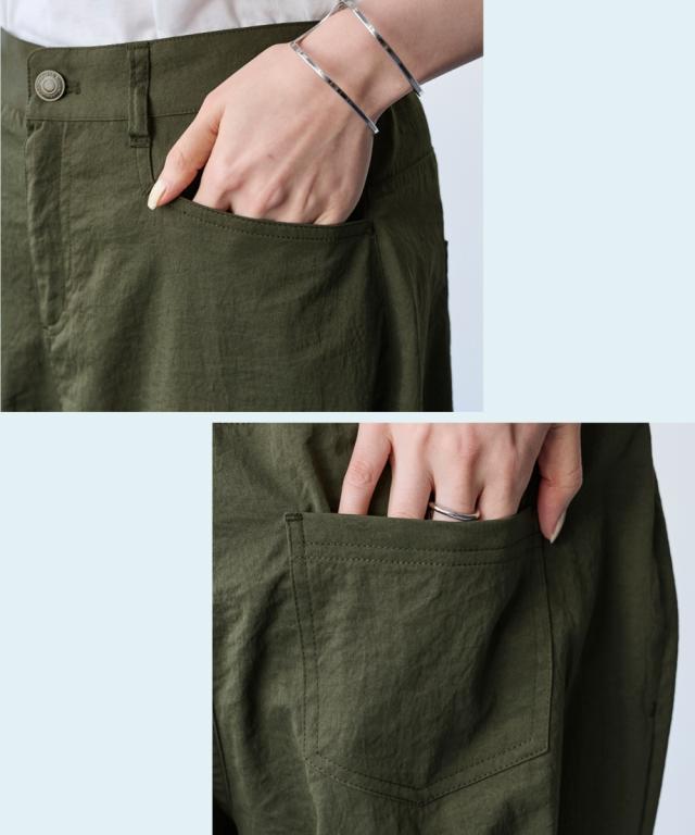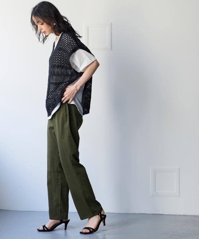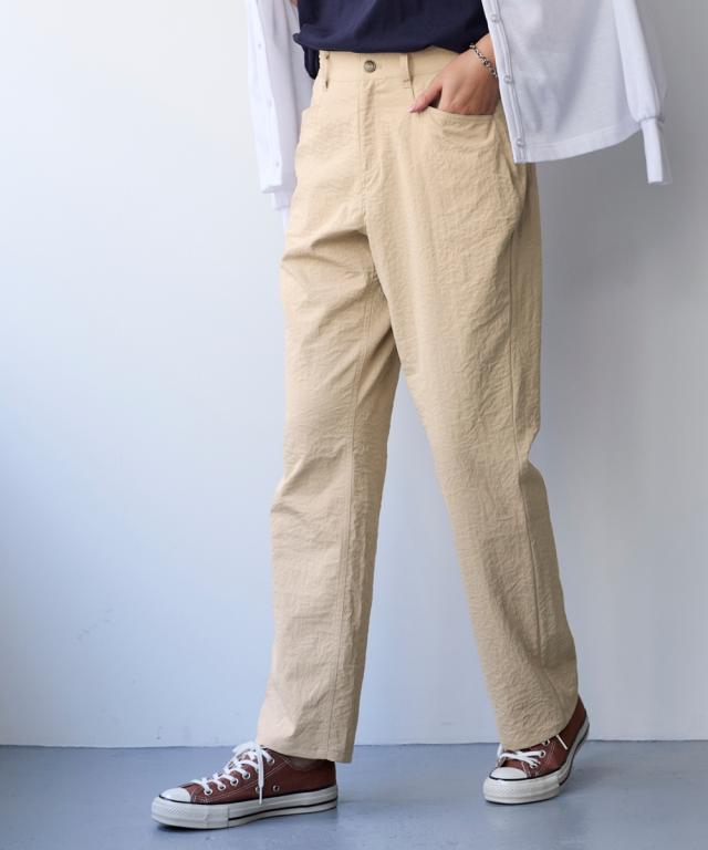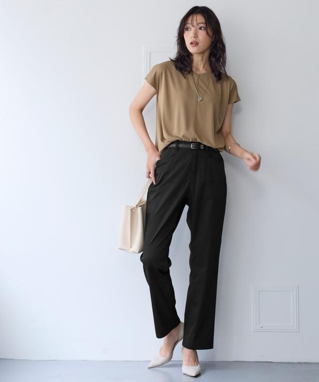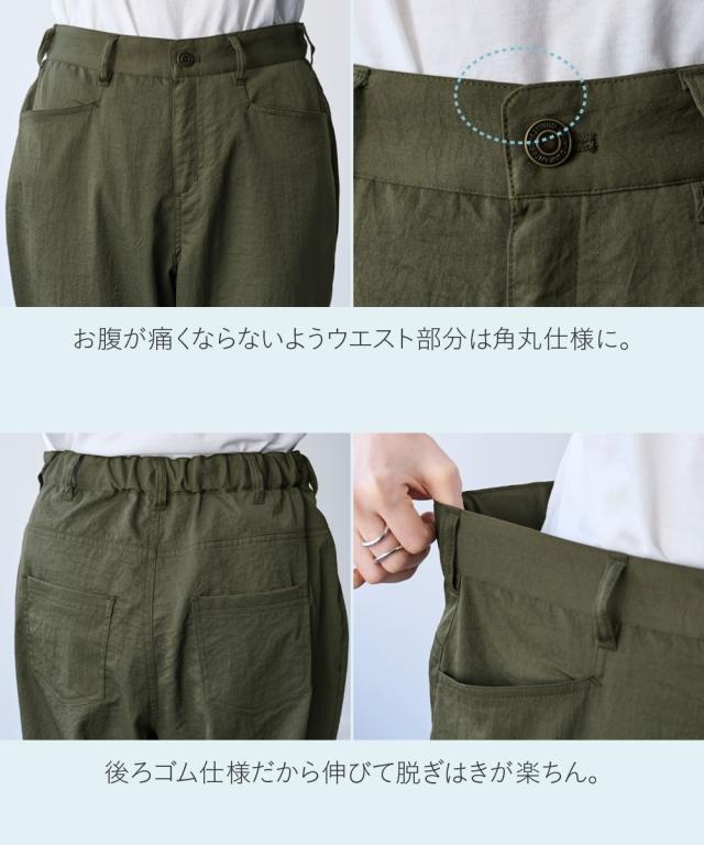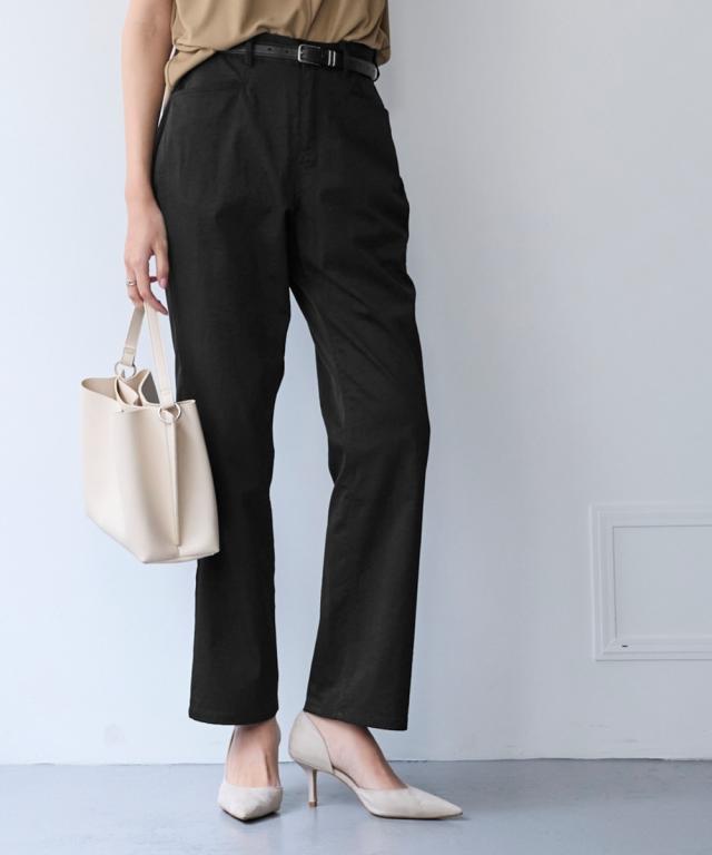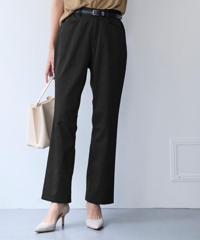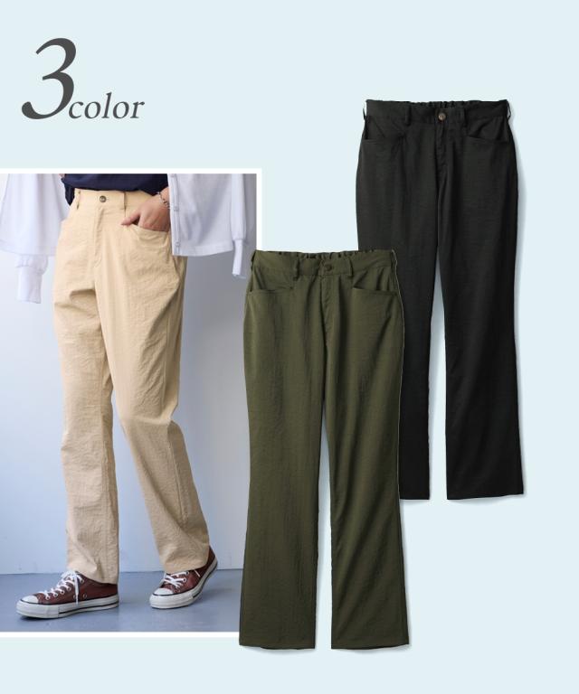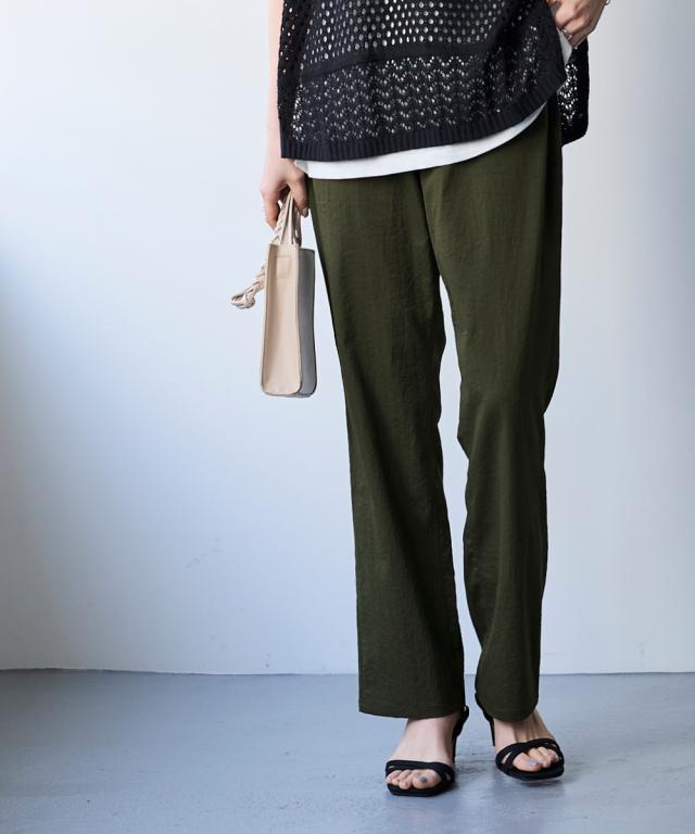 夏の快適ライトチノストレートパンツ。 接触冷感・ストレッチ・シワが付きにくいの多機能素材という優れもの ■デザイン シンプルデザインで、すっきり見えるストレートシルエット。 ウエストは、後ろゴム入りで前はすっきり履きこなしながら、着脱もらくちんなストレスフリーな履き心地。 前後に便利なポケット付き。 ■素材 生地の表面の細かいシボ感と、柔らかな光沢が独特の風合いが上品見えします。 さらりとした肌触りに、接触冷感・ストレッチ性・シワが付きにくいの多機能素材。 お洗濯後のシワも目立ちにくく、履き心地もお手入れも快適な万能素材です。 シワにもなり難く、お手入れも楽なので、旅行時などの長時間着用でも気にせずに過ごせるのも魅力です。 ■おすすめのスタイリング Tシャツ合わせのラフな着こなしのほか、きれいめなブラウスやシャツと合わせた大人のカジュアルなコーディネートを楽しめます。