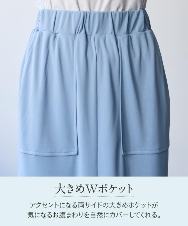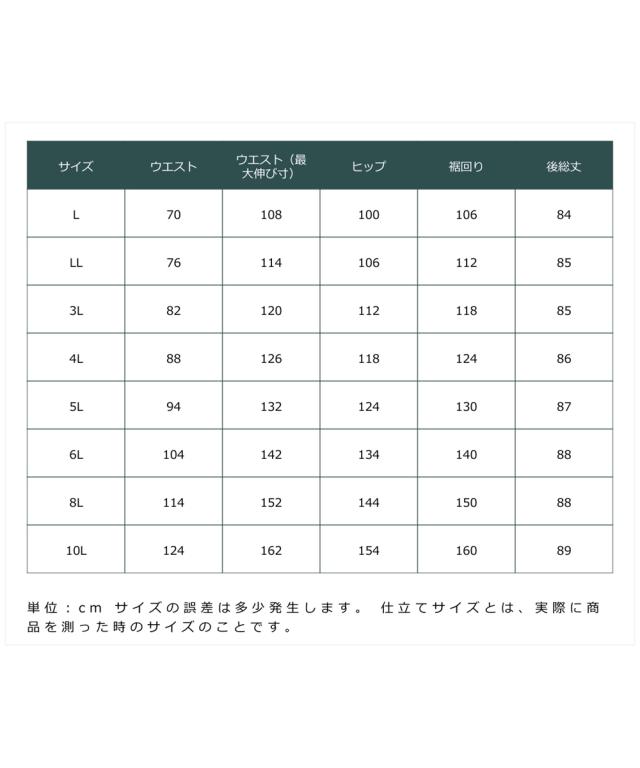品質=[本体]ポリエステル100% 後ろスリット約20cm 透け感:淡色は 伸縮性:ややあり 生地の厚み:普通 光沢感:なし 裏地:なし ポケット:あり(前2つ) ウエスト:後ゴム 夏 シルエット:普通 原産国:中国製 備考:洗濯機OK ネット使用 ※単位:cm ※サイズの誤差は多少発生します。 ※仕立てサイズとは、実際に商品を測った時のサイズのことです。