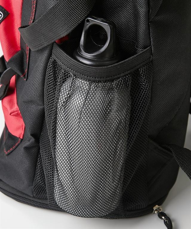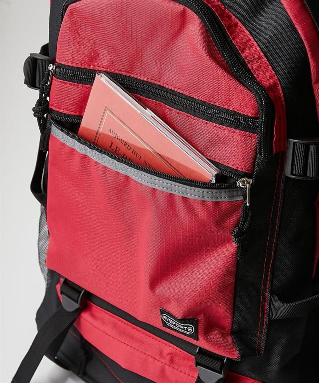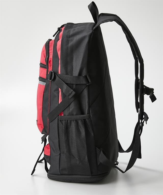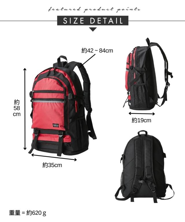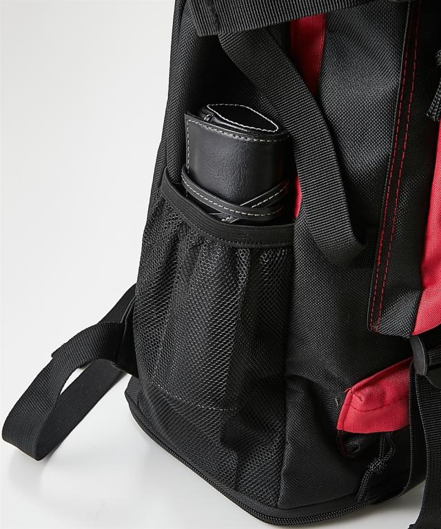 材質=ポリエステル サイズ=たて約58×よこ約35×まち幅約19cm 開閉=ファスナー ポケット=中:1個(オープン1)外:6個(ファスナー4、メッシュ2) 肩ひも長さ=約42〜84cm 重量=約620g A4ファイル対応 原産国:中国製 備考:単位:cm ※サイズの誤差は多少発生します。