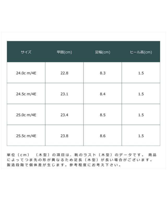材質=合成皮革 底材=合成底 ヒール=約1.5cm ワイズ=4E 重量=約190g(4E:24.0cm片足)※生産時期や素材などによって多少個体差があります。 原産国:日本製 備考:単位(cm) ※(木型)の項目は、靴のラスト(木型)のデータです。 ※商品によってつま先の形が異なるため足長(木型)が長い場合がございます。 ※製造段階で個体差が生じます。参考程度にお考え下さい。