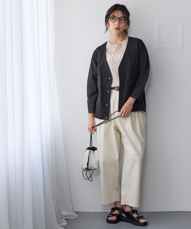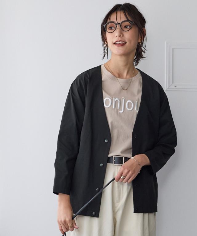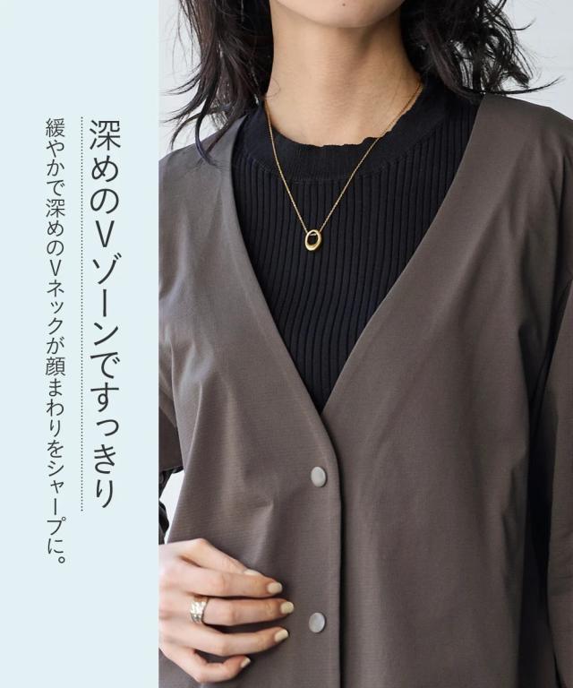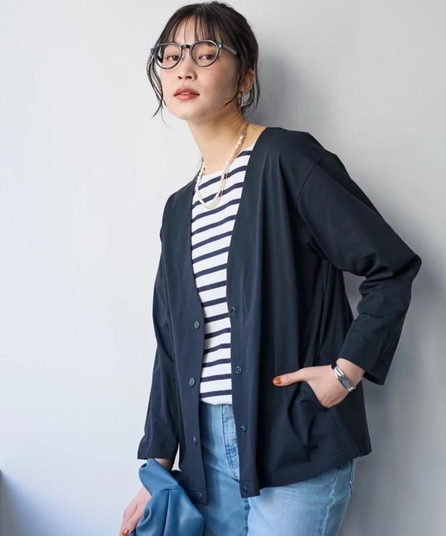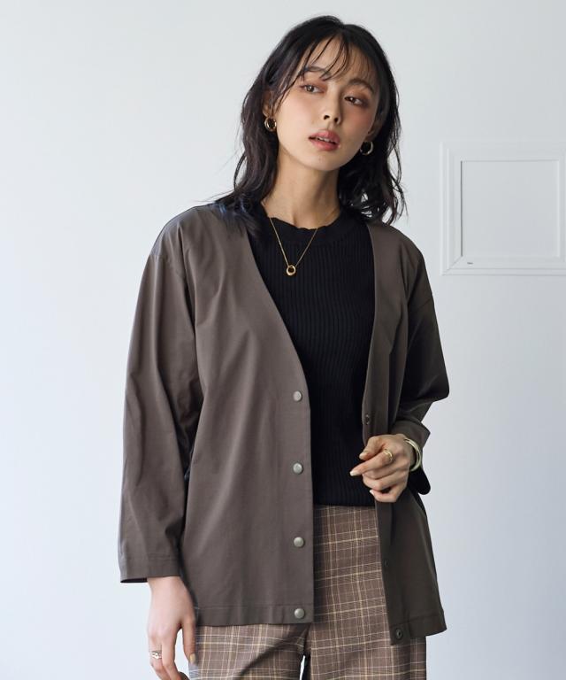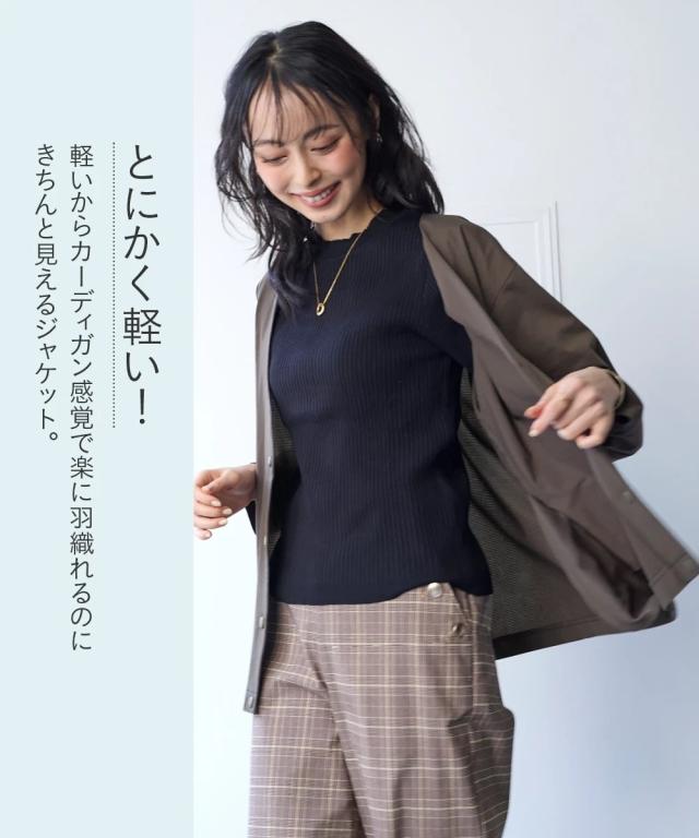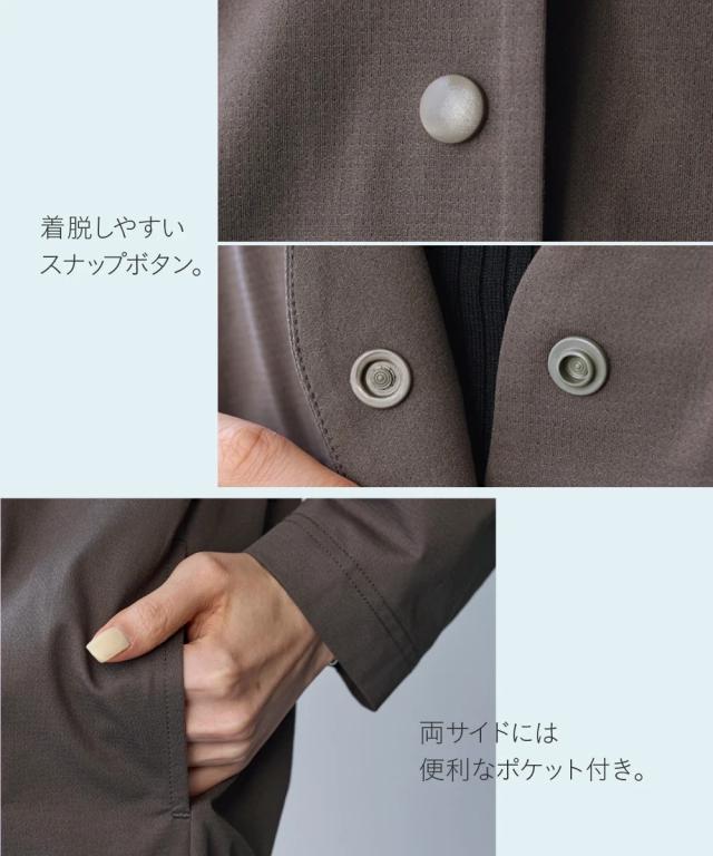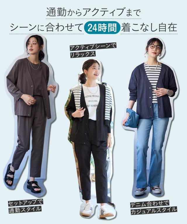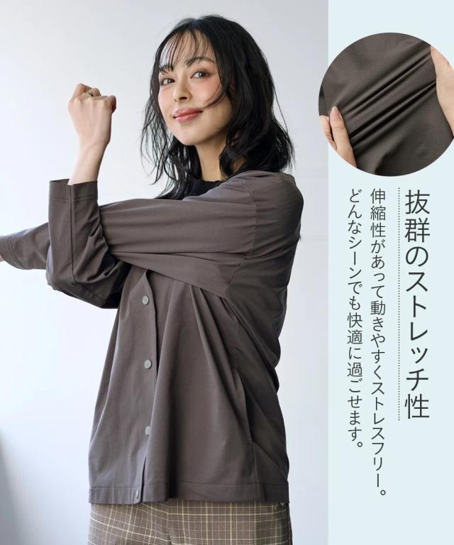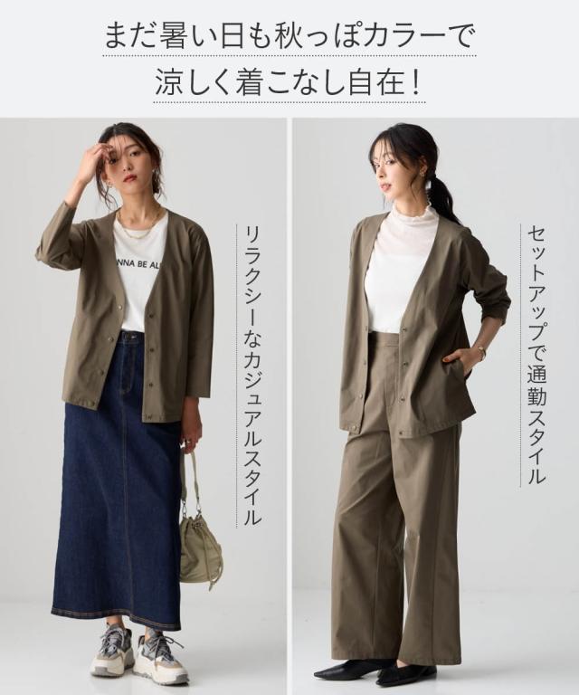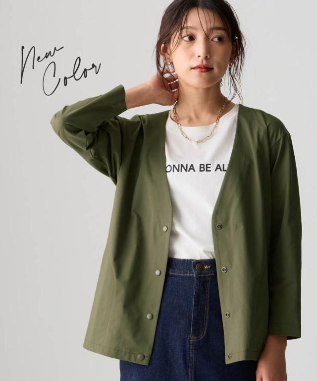 家でも外でもお出かけ時もずっと快適!軽くて涼しくさらさら!風が通るので涼しく蒸れません!伸縮性があるので1日中、着てても楽々なのにきちんと見えるのでお出かけ〜通勤までOKな便利ジャケット■デザインシンプルなVネックのノーカラーでカジュアルもキレイ目も両方OK。Vネックなので顔周りをスッキリ見せてくれて中に合わせるものも選びません。ゆるっとしたシルエットで体型カバーしつつ着ていて楽々。スナップボタンで着脱も楽々です。もちろん便利なポケット付き。スカートやワイドパンツとも相性よい丈感なので着まわせて便利。■素材メッシュ構造で空気が通るので涼しく快適。表からはわからなくなっているのできちんとスタイルも問題なし。吸汗速乾機能で汗をかいてもすぐ乾くのでベタベタしにくく快適に過ごせます。伸縮性があるので着ていて楽々。ジャケットなのに洗濯機で洗えちゃう。ポリエステルなのでしわになりにくく、洗濯後の乾きも早くて毎日の洗い代えに便利。イージーケアなので洗濯後のケアも楽々。■おすすめのスタイリングVネックでスッキリした印象になるのでインに合わせるものを選ばず着回しがきいて便利。ボリュームのあるワイドパンツやロングスカートとも相性良く着ま