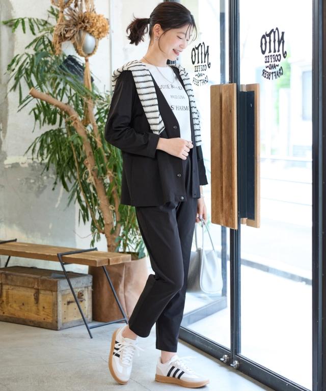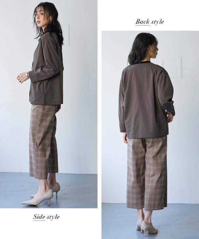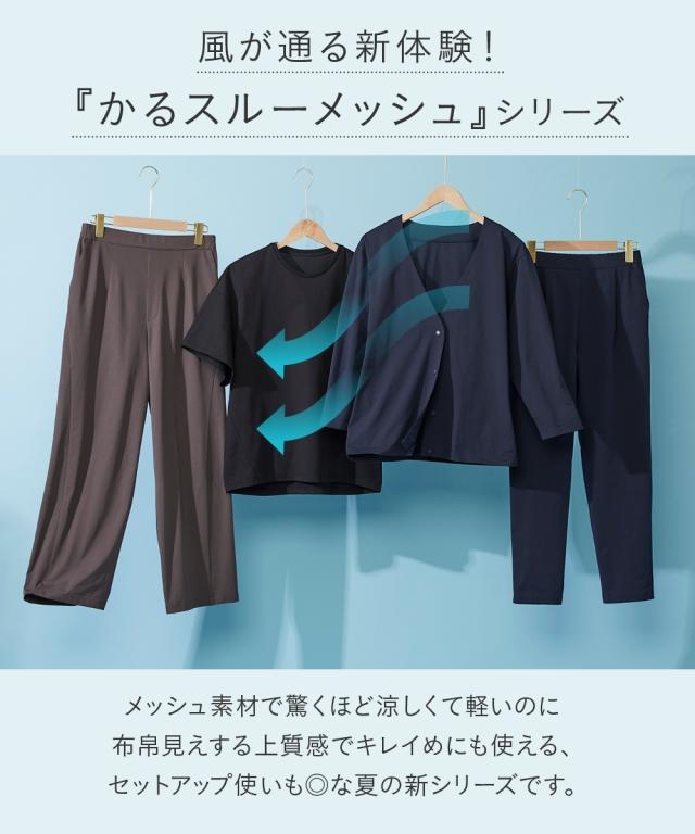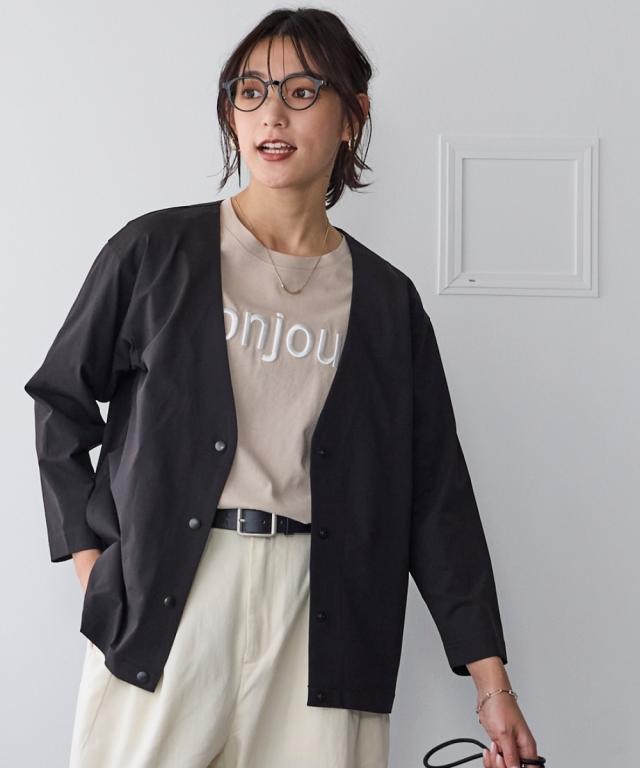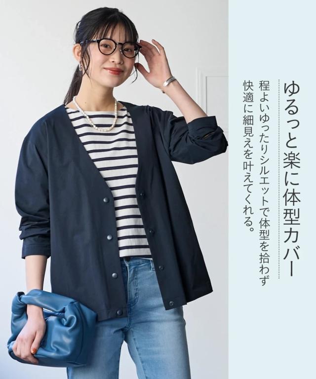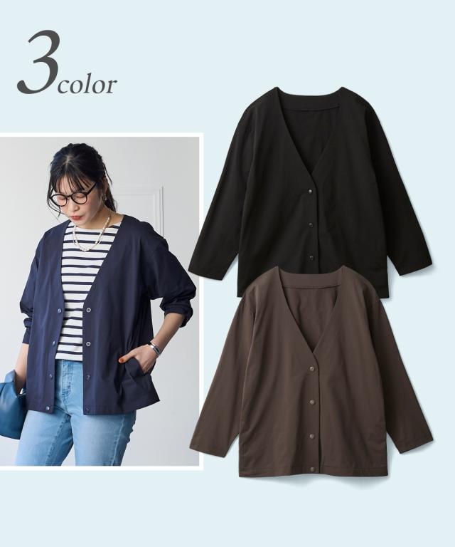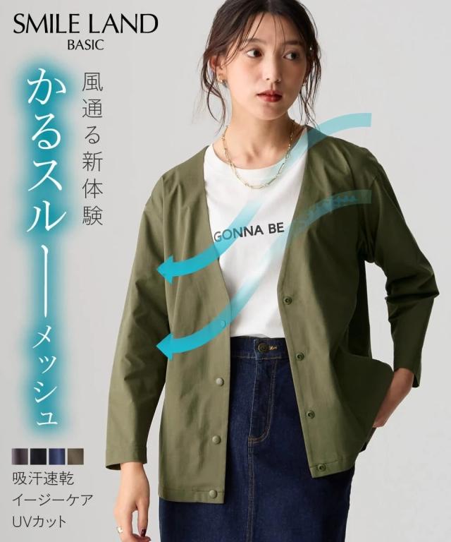 家でも外でもお出かけ時もずっと快適!軽くて涼しくさらさら!風が通るので涼しく蒸れません!伸縮性があるので1日中、着てても楽々なのにきちんと見えるのでお出かけ〜通勤までOKな便利ジャケット■デザインシンプルなVネックのノーカラーでカジュアルもキレイ目も両方OK。Vネックなので顔周りをスッキリ見せてくれて中に合わせるものも選びません。ゆるっとしたシルエットで体型カバーしつつ着ていて楽々。スナップボタンで着脱も楽々です。もちろん便利なポケット付き。スカートやワイドパンツとも相性よい丈感なので着まわせて便利。■素材メッシュ構造で空気が通るので涼しく快適。表からはわからなくなっているのできちんとスタイルも問題なし。吸汗速乾機能で汗をかいてもすぐ乾くのでベタベタしにくく快適に過ごせます。伸縮性があるので着ていて楽々。ジャケットなのに洗濯機で洗えちゃう。ポリエステルなのでしわになりにくく、洗濯後の乾きも早くて毎日の洗い代えに便利。イージーケアなので洗濯後のケアも楽々。■おすすめのスタイリングVネックでスッキリした印象になるのでインに合わせるものを選ばず着回しがきいて便利。ボリュームのあるワイドパンツやロングスカートとも相性良く着ま