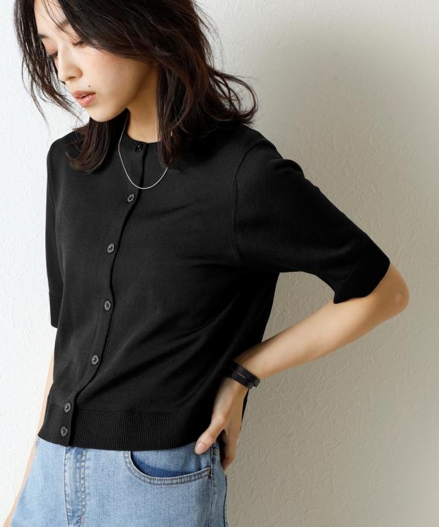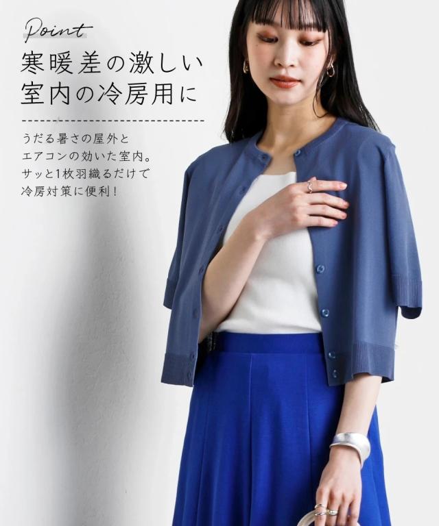 カーディガン ニット レディース クルーネック 5分袖 持続冷感 接触冷感 毛玉になりにくい UVカット 洗濯機で洗える 遮熱