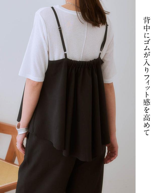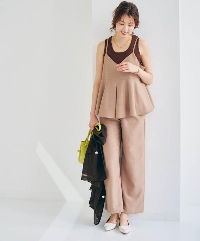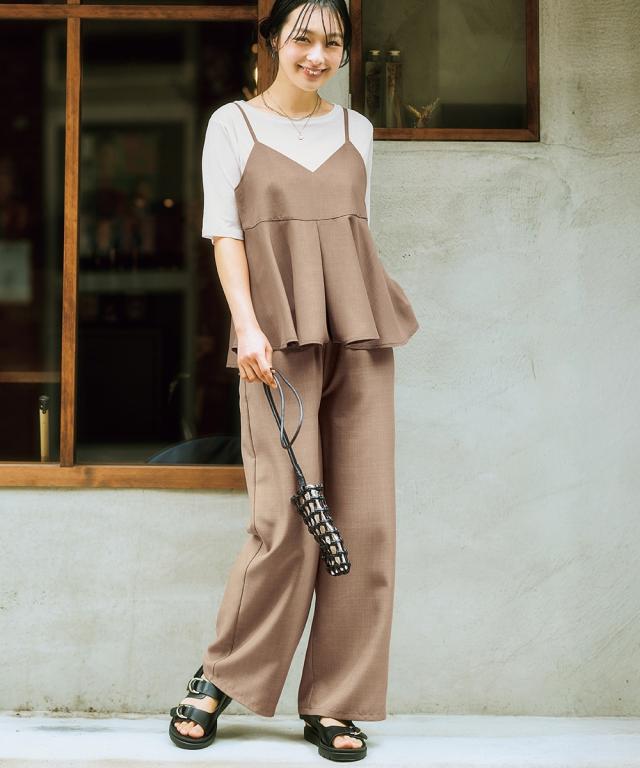 「楽ちん」と「可愛い」を叶える、着回し抜群のキャミソールセットアップ。 忙しい朝も、サッと着るだけでコーデが決まるから、毎日のおしゃれが楽しくなるんです。 体のラインを拾いすぎないゆったりシルエットで、体型カバーも叶えちゃいます。 お洗濯も簡単だから、ストレスフリーで着られるのも嬉しいポイント。 いつもの自分よりちょっとだけ、おしゃれを楽しみたいあなたにぴったりです。 ■デザイン トップスは、上品な印象のタックデザイン。 デコルテラインを美しく見せてくれる、華奢見え効果も期待できます。 パンツは、脚長効果もあるセミワイドシルエット。 気になるヒップラインをさりげなくカバーしてくれるので、スタイルアップ効果も抜群です。 ウエストはゴム仕様なので、締め付け感もなく、リラックスして着用できます。 ■素材 ポリエステル100%なので、シワになりにくく、お手入れも簡単。 ご自宅で洗濯できるので、忙しい方にもおすすめです。 さらっとした肌触りで、快適な着心地です。 ■おすすめのスタイリング カジュアルスタイル: 白Tシャツをインナーに合わせ、スニーカーを履けば、カジュアルだけど女性らしい着こなしに。 休日に公園へのお出かけや、ショッピング