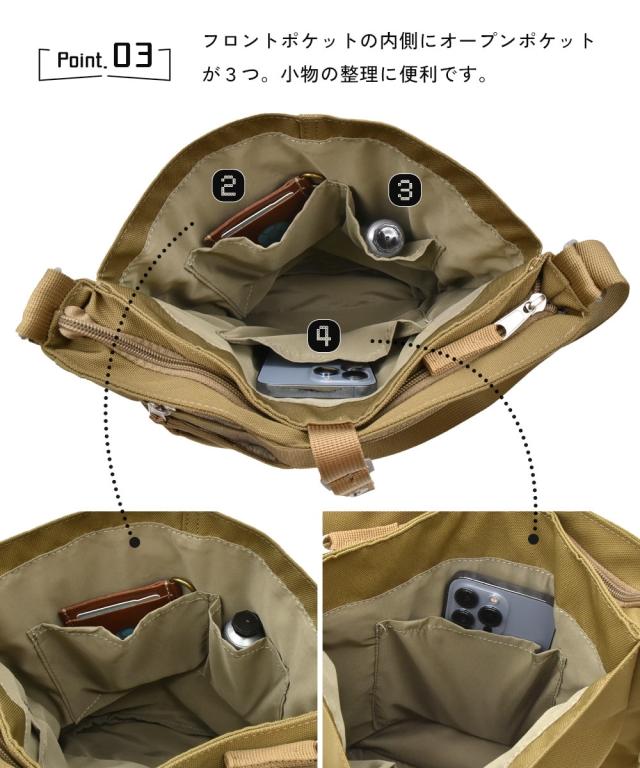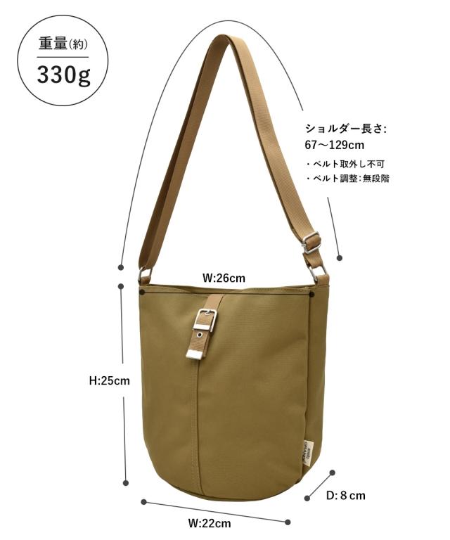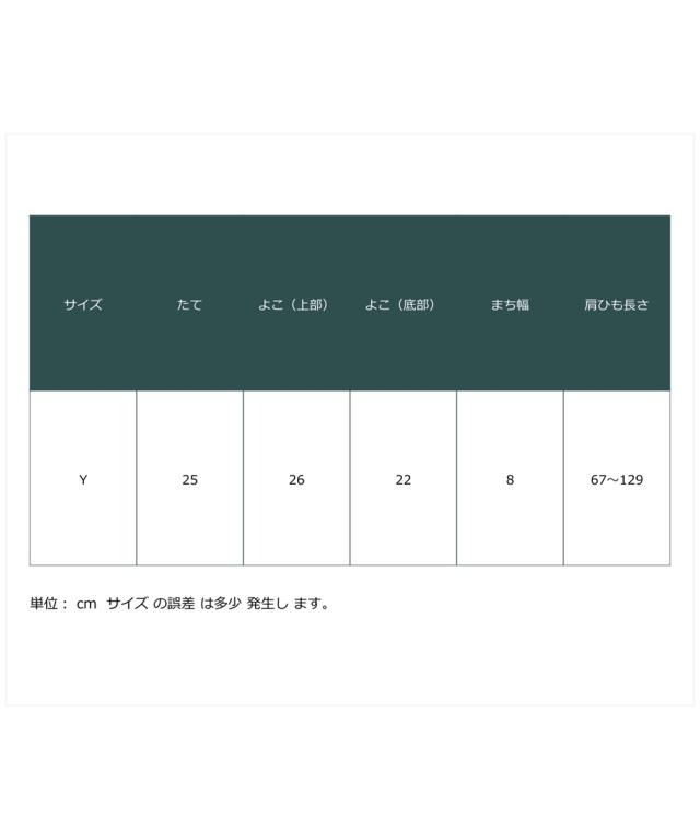 材質=ポリエステル サイズ=たて約25×よこ(上部)約26×よこ(底部)約22×まち幅約8cm 開閉=ファスナー ポケット=中:7個(オープン6、ファスナー1)外:3個(マグホック2、ファスナー1) 肩ひも長さ=約67〜129cm 重量=約330g 原産国:中国製 備考:単位:cm ※サイズの誤差は多少発生します。