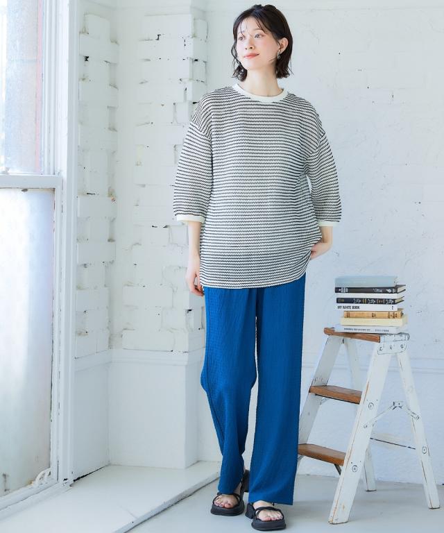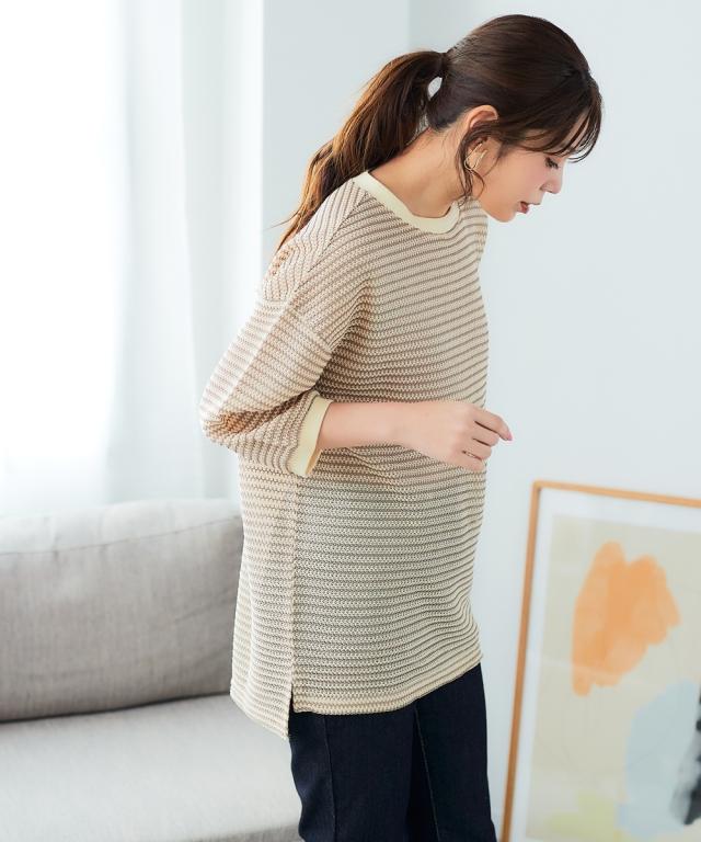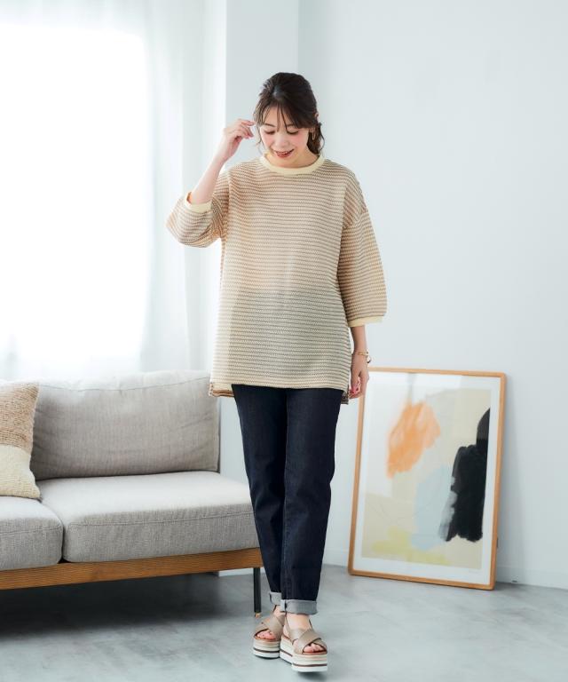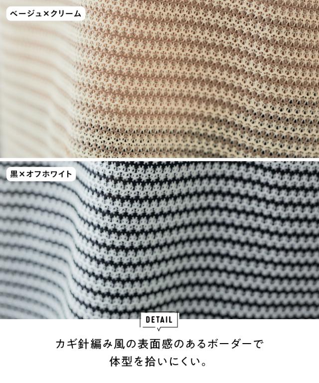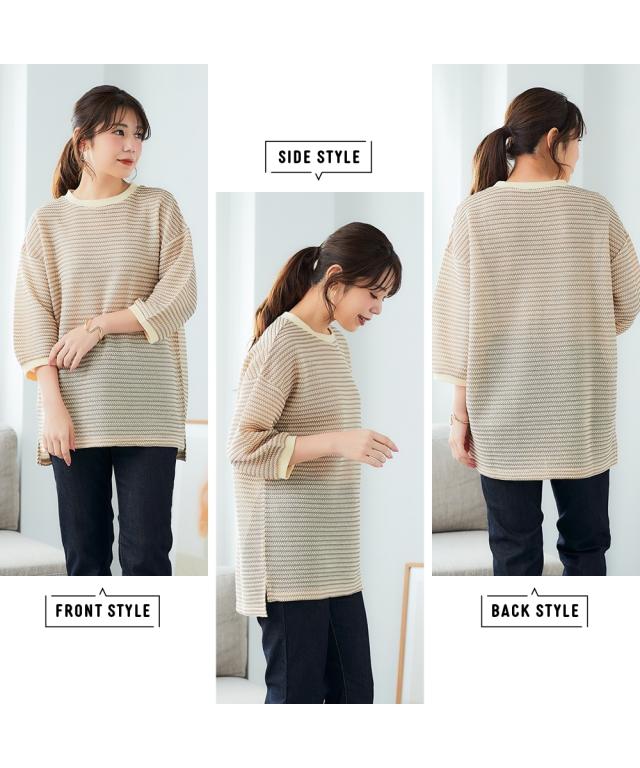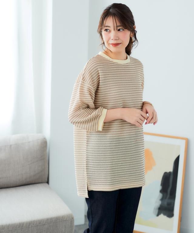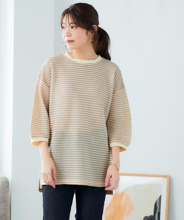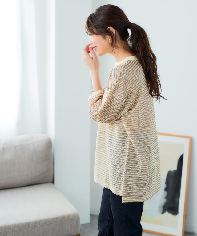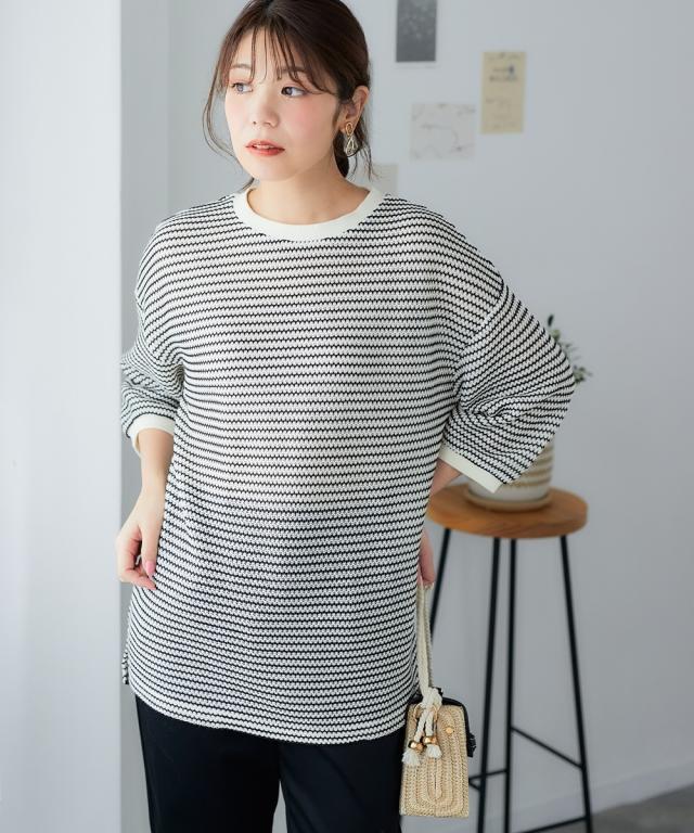 「着心地抜群なのに、きちんと感もあるから、お洒落見えも叶う」 休日はもちろん、お仕事にも着ていけるから、ヘビロテ間違いなし! カギ針編風のボーダー柄が、カジュアルだけど大人っぽく、着るだけでこなれ感を演出してくれます。 ゆったりシルエットで体型カバーもできちゃうから、自信を持って着こなせるのも嬉しいポイント。 お洗濯も簡単だから、忙しい毎日でもストレスフリーに過ごせます。 ■デザイン カギ針編風のボーダー柄が、カジュアルだけど大人っぽく、着るだけでこなれ感を演出してくれます。 ゆったりシルエットで気になる二の腕もすっぽり隠せるので、体型カバーも叶えちゃいます。 着心地抜群なのに、きちんと感もあるから、休日はもちろん、お仕事にも着ていけるから、ヘビロテ間違いなし! ■素材 シワになりにくく、お手入れも簡単です。 さらっとした肌触りで、着心地も抜群! 伸縮性もあるので、窮屈さを感じることなく、リラックスして着用できます。 ■おすすめのスタイリング スキニーデニムを合わせて、カジュアルだけど大人っぽい着こなしに。 足元はスニーカーやフラットシューズで、抜け感をプラスするのがおすすめです。 アクセサリーやバッグで、自分らしいアク