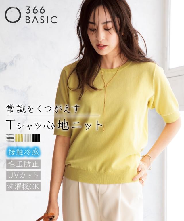 Tシャツ感覚で、上品かつ大人な雰囲気に着られるベーシックニットプルオーバー。 さらっとした肌触りが気持ち良い、綿混素材のニットトップスです。 ■デザイン 幅広いコーデに合わせやすい、シンプルで洗練されたベーシックニットTシャツ。 少し長めでゆとりのある半袖だから、気になる二の腕もさりげなくカバー。 カジュアルになりすぎない、大人にぴったりなサマーニットです。 オフィスカジュアルにもおすすめ! ■素材 きれい見えなのにTシャツ心地&Tシャツのような扱いやすさが嬉しい素材です。 特殊な構造の糸を使っているので、通常の綿混素材よりシャリ感が増し、清涼感・さらさら感がアップした快適な着心地です。 綿の毛羽が抑えられた構造のため、毛玉ができにくくキレイが長持ち。 暑い季節に嬉しい接触冷感で、肌にひんやりと触れて涼しく、さらっと着られます。 薄手でもUVカットしてくれるのも嬉しいポイント。 洗濯機で洗えるのでお手入れもラクラク ■おすすめのスタイリング 汎用性のあるベーシックデザインなので、Tシャツ感覚でさらっと一枚で着こなしたり、トレンド感のあるボトムスとも好相性。 サロペットやジャンスカのインナーとしてもおすすめ。