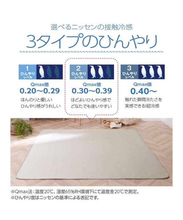 初めての接触冷感ラグにおすすめ とにかくお買い得価格にこだわりました。ベーシックなブルーとグレーのお部屋やインテリアになじみやすい2カラーをご用意しました。ひんやりレベル2の冷たさ エアコンを併用することでさらに快適に。90×130cm、130×185cm、185×185cm、185×240cmの4サイズからシーンに合わせてお選びいただけます。90×130cmはデスク下やペット用にもおすすめです。汚れても手洗いできるのでいつも清潔にお使いいただけます。接触冷感ラグで快適な夏をお過ごしください ■こだわりポイント・お買い得価格・ひんやりレベル2・手洗い可能・裏面滑りにくい加工・リビングになじむ2カラー■おすすめシーズン夏■おすすめシチュエーションリビング/ベッドルーム/センターラグ/デスク下■こんな方におすすめ接触冷感ラグを初めて使う方ひんやりとしたラグをお探しの方手洗いできて清潔に使いたい方程よいクッション性が欲しい方■ブランドニッセンオリジナル