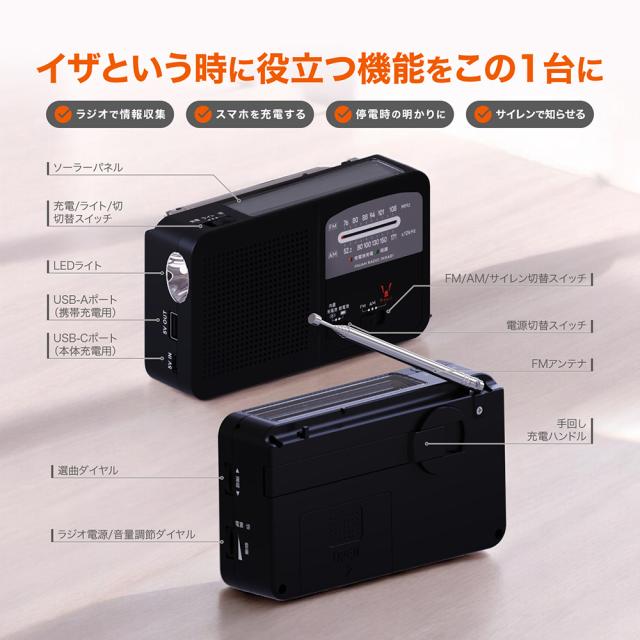 | 商品名 | 防災ラジオ ポータブル AM/FMラジオ ワイドFM対応 FM補完放送 スマホ充電 モバイルバッテリー LEDライト 懐中電灯 サイレン 防犯ブザー 乾電池 単4形乾電池3本 USB充電 ソーラー充電 手回し充電 非常用 防災用品 JKRAB1 |