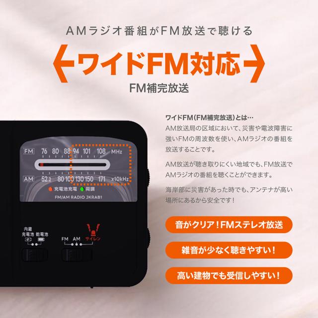 防災ラジオ ポータブル AM/FMラジオ ワイドFM対応 FM補完放送 スマホ充電 モバイルバッテリー LEDライト 懐中電灯 サイレン 防犯ブザー 乾電池 単4形乾電池3本 USB充電 ソーラー充電 手回し充電 非常用 防災用品 JKRAB1