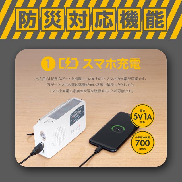 | 出力用のUSB-Aポートを搭載していますので、スマホの充電が可能です。万が一スマホの電池残量が無い状態で被災したとしても、スマホを充電し家族の安否を確認することが可能です。 |